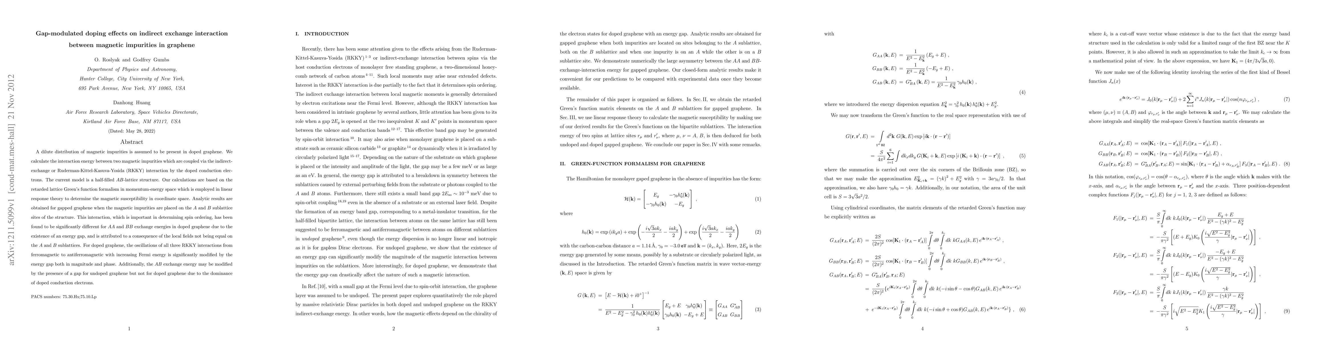 This study investigates the indirect exchange interaction, or RKKY interaction, between magnetic impurities in doped graphene, finding significant differences in $AA$ and $BB$ exchange energies due to the presence of an energy gap, which modifies the RKKY interaction's oscillations in response to changes in Fermi energy. The effect is attributed to unequal local fields on $A$ and $B$ sublattices.