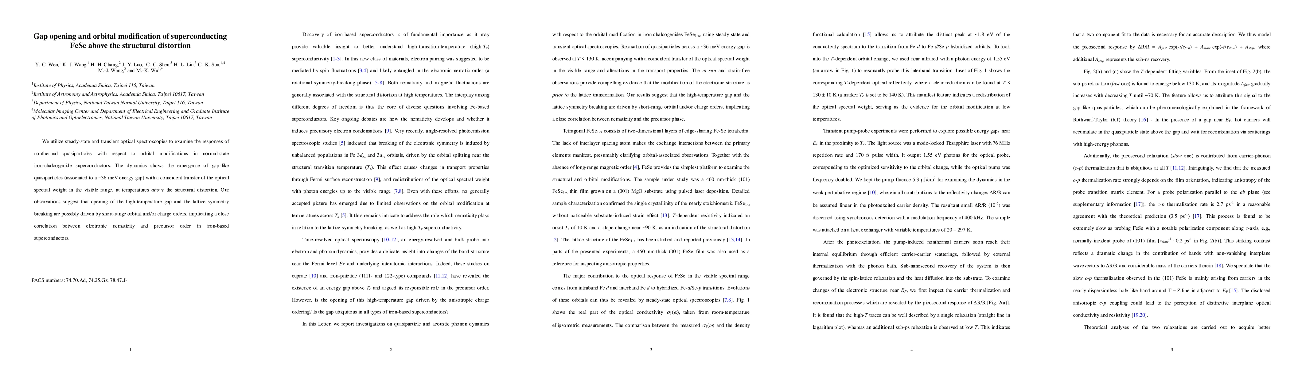 We utilize steady-state and transient optical spectroscopies to examine the responses of nonthermal quasiparticles with respect to orbital modifications in normal-state iron-chalcogenide superconductors. The dynamics shows the emergence of gap-like quasiparticles (associated to a ~36 meV energy gap) with a coincident transfer of the optical spectral weight in the visible range, at temperatures above the structural distortion. Our observations suggest that opening of the high-temperature gap and the lattice symmetry breaking are possibly driven by short-range orbital and/or charge orders, implicating a close correlation between electronic nematicity and precursor order in iron-based superconductors.