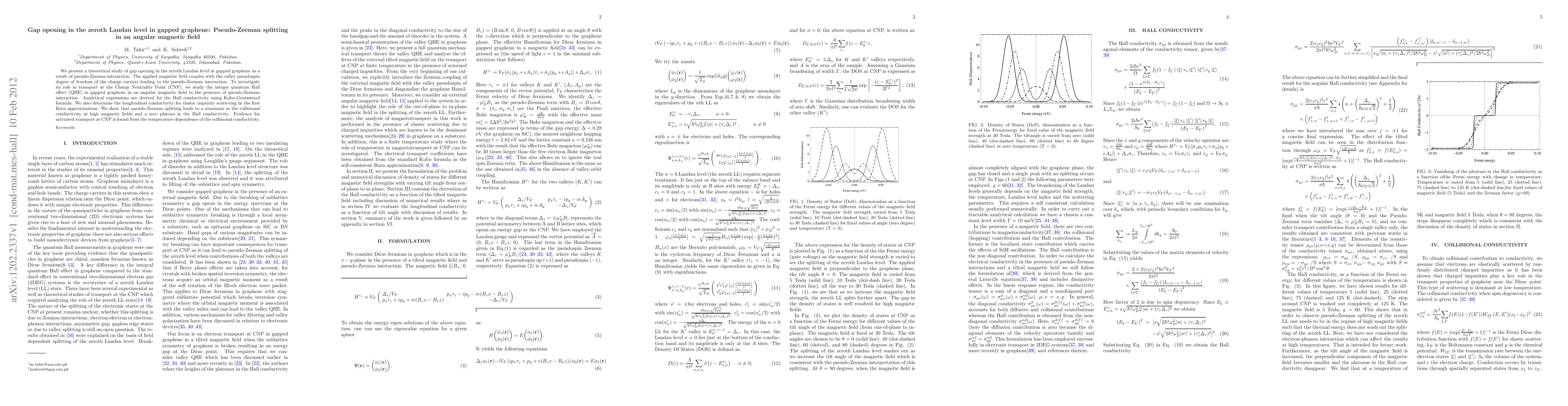 We present a theoretical study of gap opening in the zeroth Landau level in gapped graphene as a result of pseudo-Zeeman interaction. The applied magnetic field couples with the valley pseudospin degree of freedom of the charge carriers leading to the pseudo-Zeeman interaction. To investigate its role in transport at the Charge Neutrality Point (CNP), we study the integer quantum Hall effect (QHE) in gapped graphene in an angular magnetic field in the presence of pseudo-Zeeman interaction. Analytical expressions are derived for the Hall conductivity using Kubo-Greenwood formula. We also determine the longitudinal conductivity for elastic impurity scattering in the first Born approximation. We show that pseudo-Zeeman splitting leads to a minimum in the collisional conductivity at high magnetic fields and a zero plateau in the Hall conductivity. Evidence for activated transport at CNP is found from the temperature dependence of the collisional conductivity.