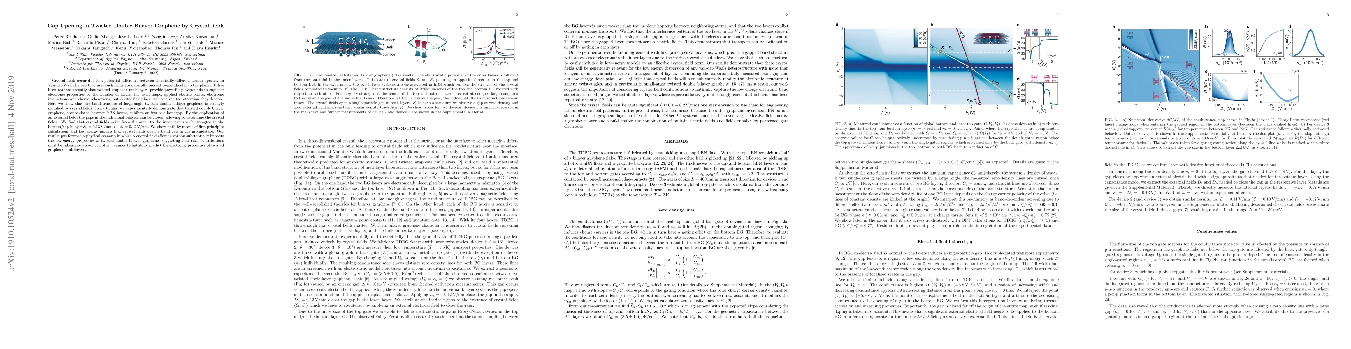This study experimentally demonstrates that crystal fields induce an intrinsic bandgap in twisted double bilayer graphene between hBN layers, which can be closed by an external field. The crystal fields exhibit strengths of -0.13 V/nm and 0.12 V/nm in the bottom and top bilayers, respectively, and are shown to significantly modify the band structure via first principles calculations and low energy models.