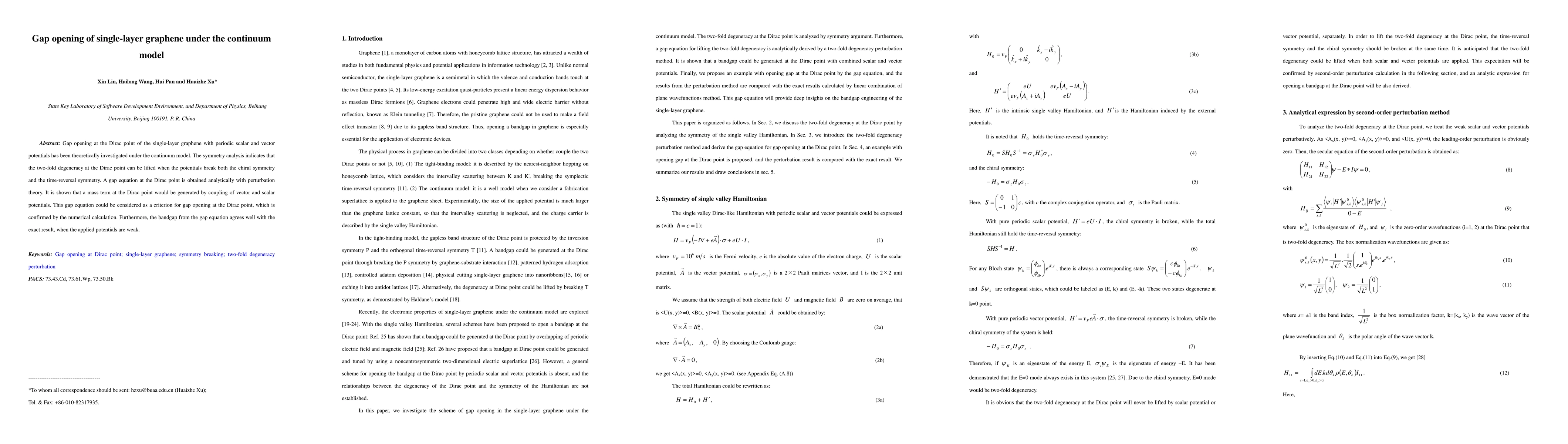 Gap opening at the Dirac point of the single-layer graphene with periodic scalar and vector potentials has been theoretically investigated under the continuum model. The symmetry analysis indicates that the two-fold degeneracy at the Dirac point can be lifted when the potentials break both the chiral symmetry and the time-reversal symmetry. A gap equation at the Dirac point is obtained analytically with perturbation theory. It is shown that a mass term at the Dirac point would be generated by coupling of vector and scalar potentials. This gap equation could be considered as a criterion for gap opening at the Dirac point, which is confirmed by the numerical calculation. Furthermore, the bandgap from the gap equation agrees well with the exact result, when the applied potentials are weak.