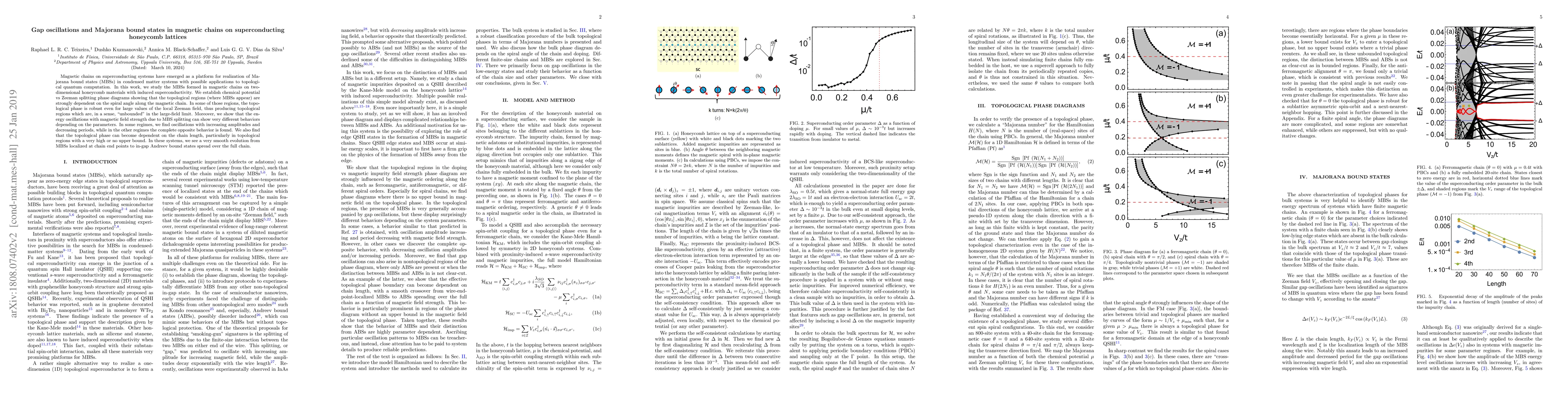 Magnetic chains on superconducting systems have emerged as a platform for realization of Majorana bound states (MBSs) in condensed matter systems with possible applications to topological quantum computation. In this work we study the MBSs formed in magnetic chains on two-dimensional honeycomb materials with induced superconductivity. We establish phase diagrams showing the topological regions (where MBSs appear), which are strongly dependent on the spiral angle along the chain of the magnetic moments. In particular, find large regions where the topological phase is robust even at large values of the local Zeeman field, thus producing topological regions without an upper bound. Moreover, we show that the energy oscillations of the MBSs can show very different behavior with magnetic field strength. In some parameter regimes we find increasing oscillations amplitudes and decreasing periods, while in the other regimes the complete opposite behavior is found with increasing magnetic field strength. We also find that the topological phase can become dependent on the chain length, particularly in topological regions with a very high or no upper bound. In these systems we see a very smooth evolution from MBSs localized at chain end points to in-gap Andreev bound states spread over the full chain.