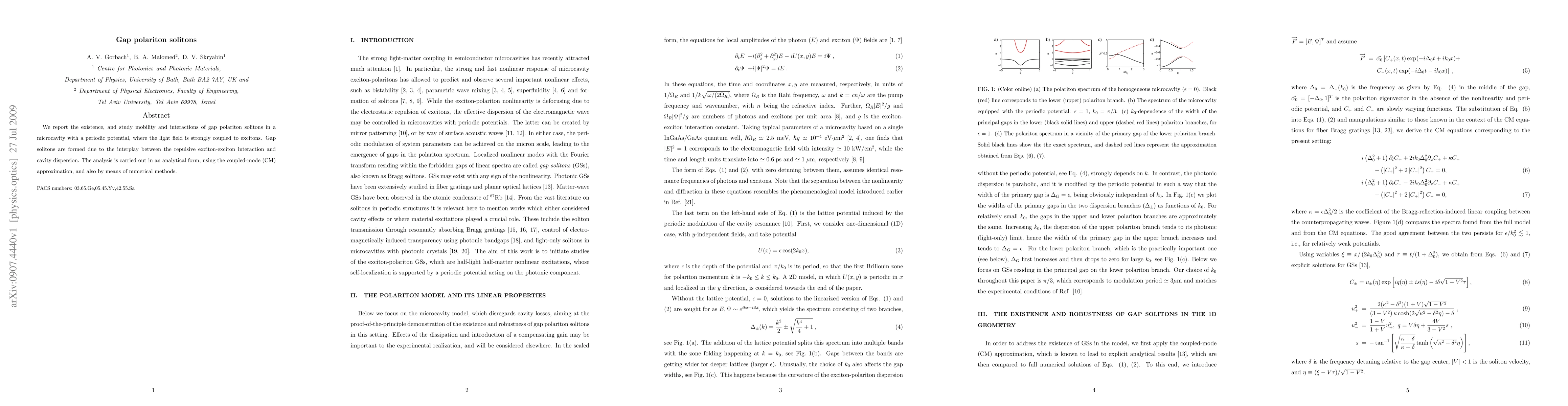 This paper investigates the existence and behavior of gap polariton solitons in a microcavity with a periodic potential, demonstrating their formation through the balance of exciton-exciton repulsion and cavity dispersion. Both analytical and numerical methods are employed to study their mobility and interactions.