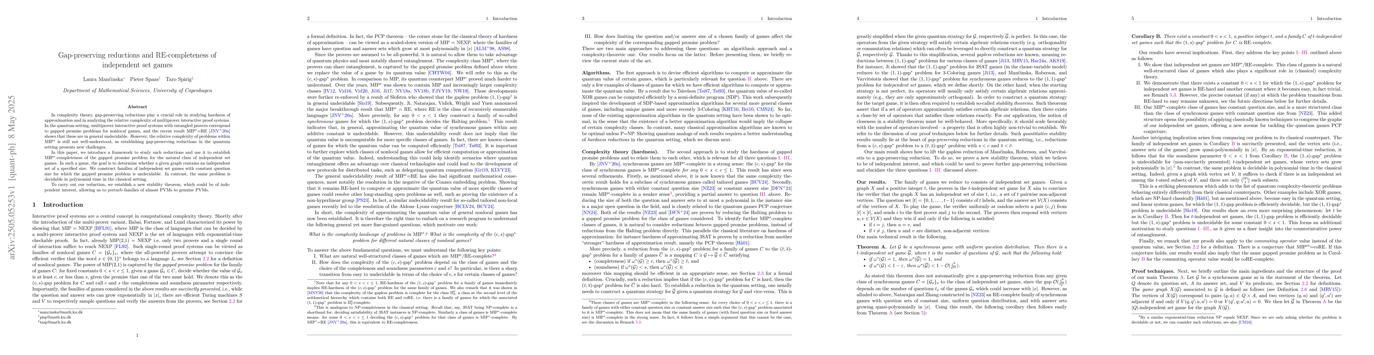 In complexity theory, gap-preserving reductions play a crucial role in studying hardness of approximation and in analyzing the relative complexity of multiprover interactive proof systems. In the quantum setting, multiprover interactive proof systems with entangled provers correspond to gapped promise problems for nonlocal games, and the recent result MIP$^*$=RE (Ji et al., arXiv:2001.04383) shows that these are in general undecidable. However, the relative complexity of problems within MIP$^*$ is still not well-understood, as establishing gap-preserving reductions in the quantum setting presents new challenges. In this paper, we introduce a framework to study such reductions and use it to establish MIP$^*$-completeness of the gapped promise problem for the natural class of independent set games. In such a game, the goal is to determine whether a given graph contains an independent set of a specified size. We construct families of independent set games with constant question size for which the gapped promise problem is undecidable. In contrast, the same problem is decidable in polynomial time in the classical setting. To carry out our reduction, we establish a new stability theorem, which could be of independent interest, allowing us to perturb families of almost PVMs to genuine PVMs.