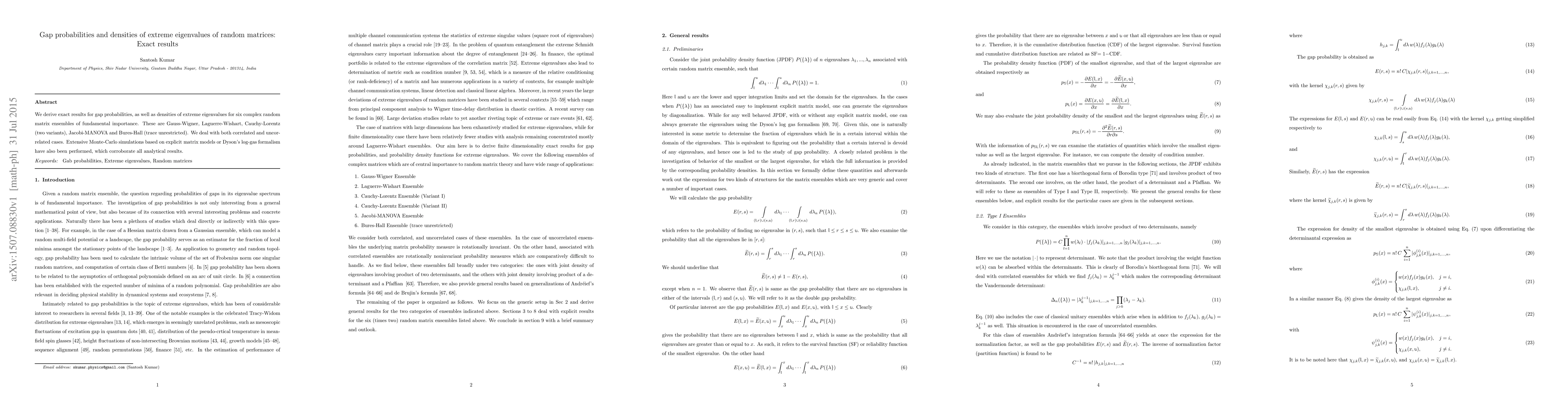 This paper presents exact analytical results for gap probabilities and extreme eigenvalue densities in six significant complex random matrix ensembles, including Gauss-Wigner, Laguerre-Wishart, and others. The study covers both correlated and uncorrelated cases, supported by extensive Monte-Carlo simulations.
