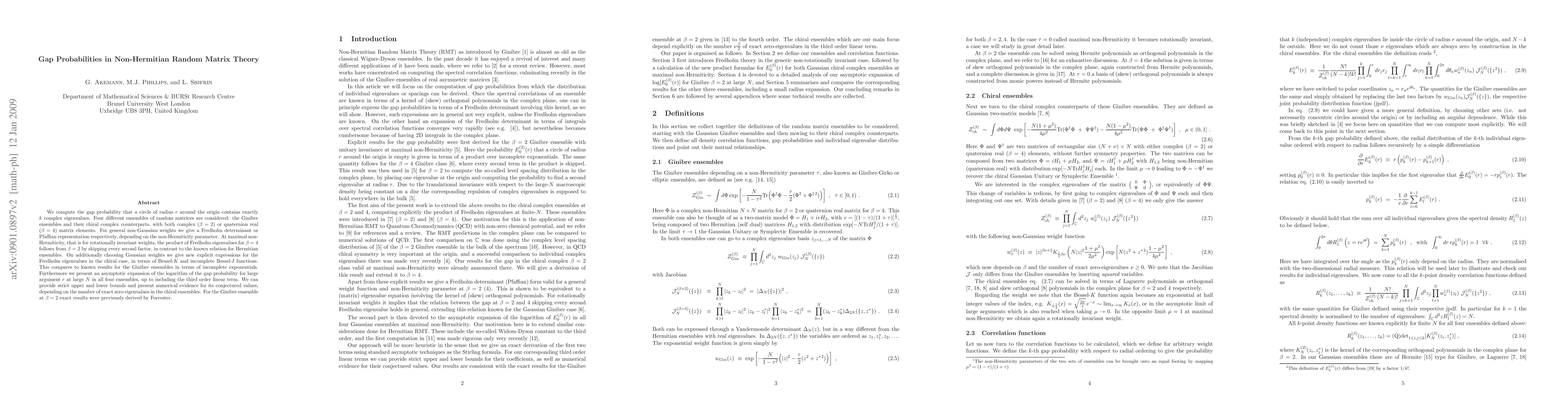 This paper investigates the gap probabilities in non-Hermitian random matrix theory for four ensembles, deriving Fredholm determinant or Pfaffian representations. It provides new explicit expressions for Fredholm eigenvalues under Gaussian weights and presents an asymptotic expansion for the logarithm of the gap probability, offering strict bounds and numerical evidence.