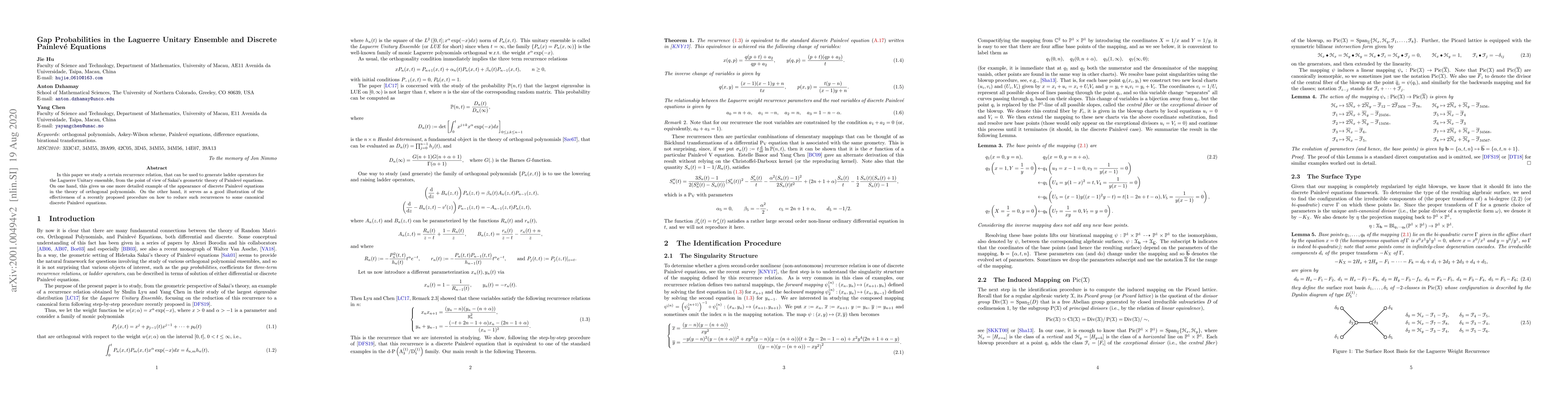 This paper explores a recurrence relation linked to the Laguerre Unitary Ensemble, connecting it to discrete Painlevé equations via Sakai's geometric theory. It exemplifies discrete Painlevé appearances in orthogonal polynomial theory and demonstrates a procedure to reduce such recurrences to canonical discrete Painlevé equations.