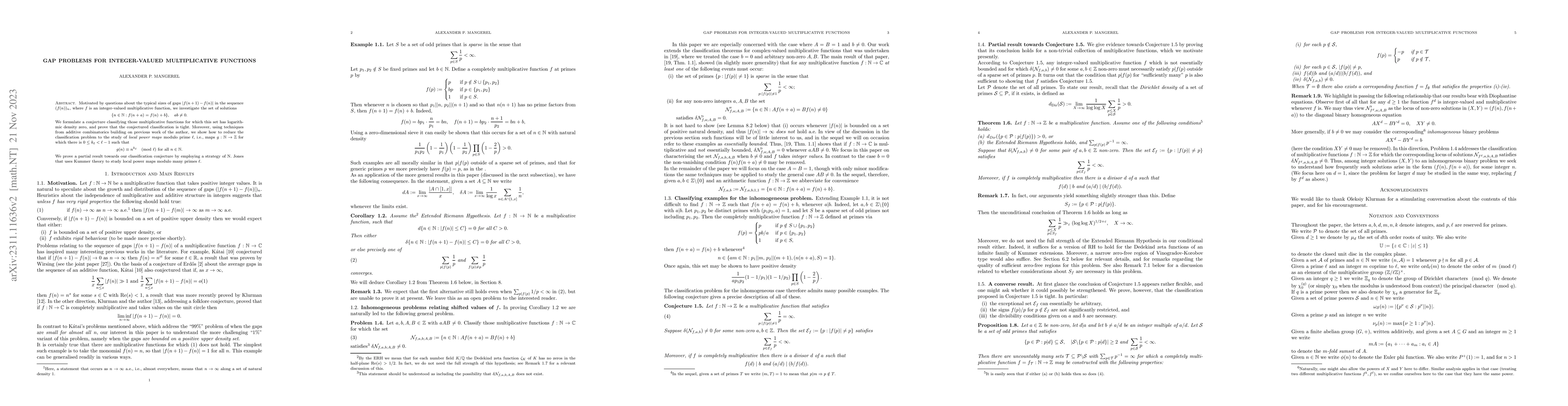 The paper introduces and develops a novel approach to gap problems for integer-valued multiplicative functions, reducing the classification problem to the study of local power maps and employing Kummer theory in the analysis.