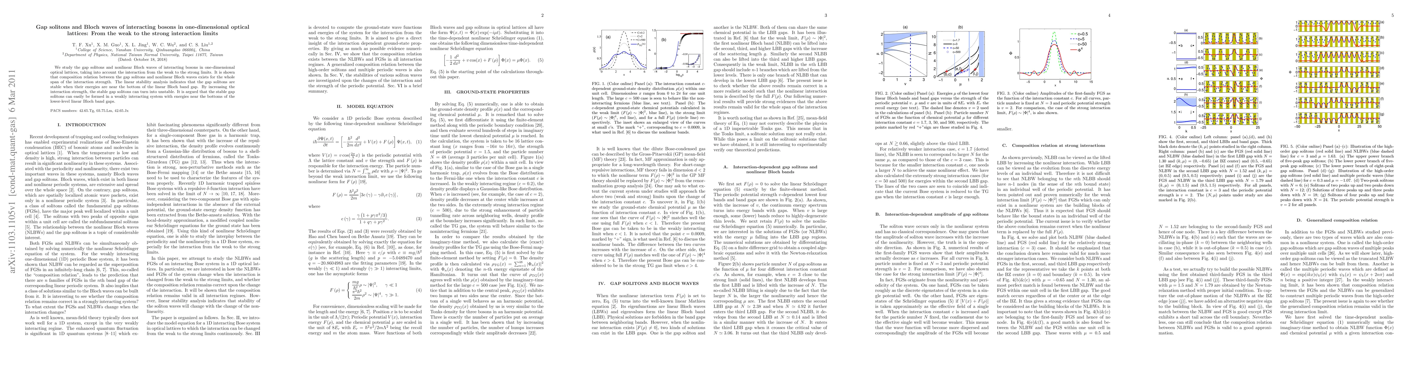 This paper investigates gap solitons and nonlinear Bloch waves in one-dimensional optical lattices with interacting bosons, spanning from weak to strong interaction limits. It reveals a compositional relationship between gap solitons and nonlinear Bloch waves across varying interaction strengths, with stable gap solitons near the bottom of the linear Bloch band gap becoming unstable with increased interaction.