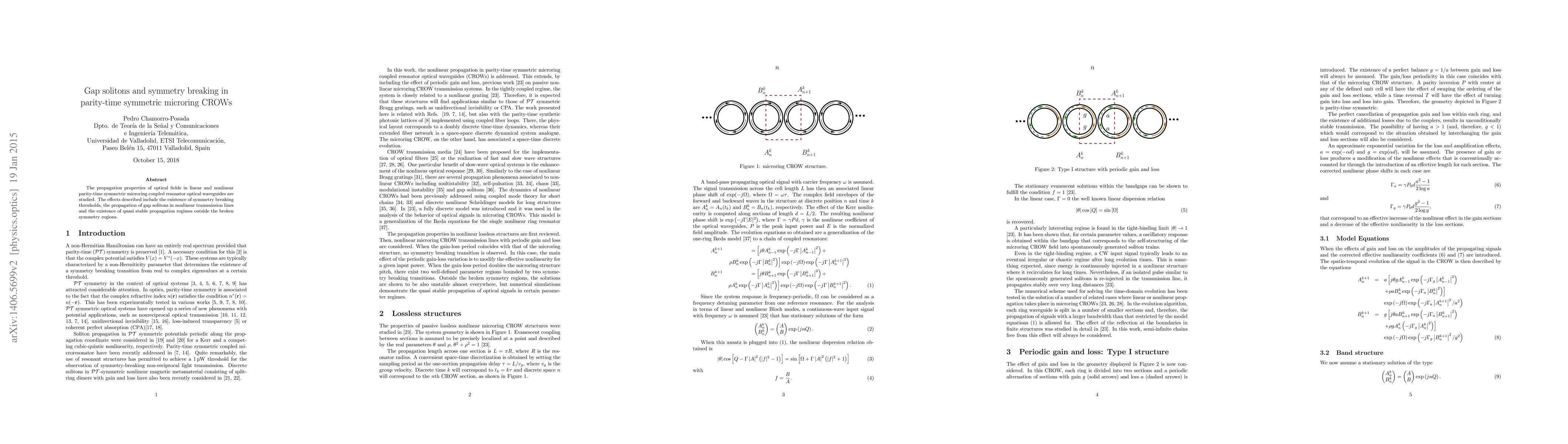 Summary: This paper investigates optical field propagation in parity-time symmetric microring CROWs, revealing symmetry breaking thresholds, nonlinear gap solitons, and quasi-stable propagation regimes beyond broken symmetry regions.