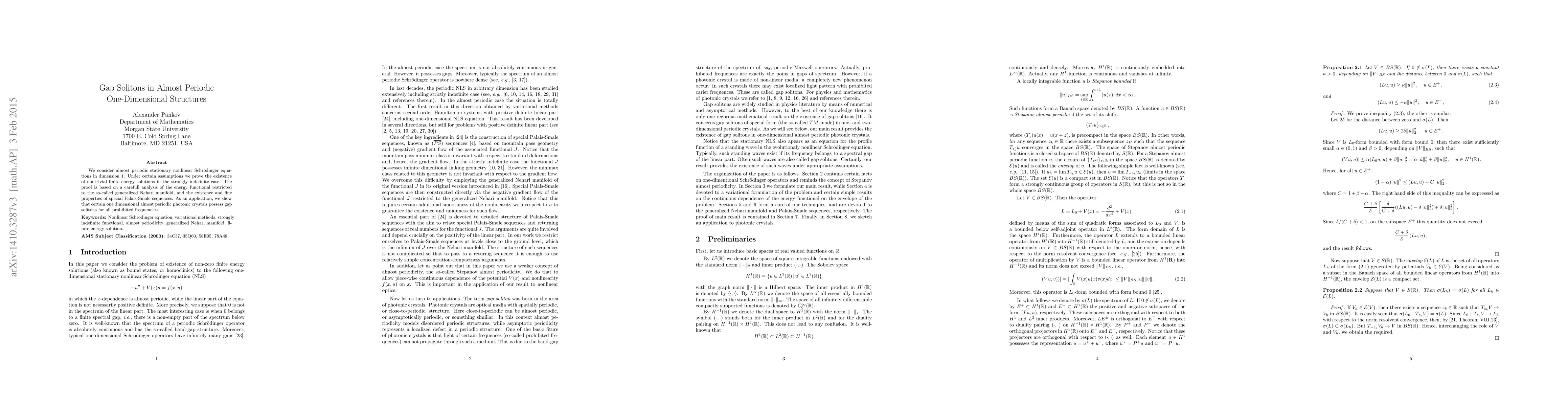 We consider almost periodic stationary nonlinear Schr\"odinger equations in dimension $1$. Under certain assumptions we prove the existence of nontrivial finite energy solutions in the strongly indefinite case. The proof is based on a carefull analysis of the energy functional restricted to the so-called generalized Nehari manifold, and the existence and fine properties of special Palais-Smale sequences. As an application, we show that certain one dimensional almost periodic photonic crystals possess gap solitons for all prohibited frequencies.