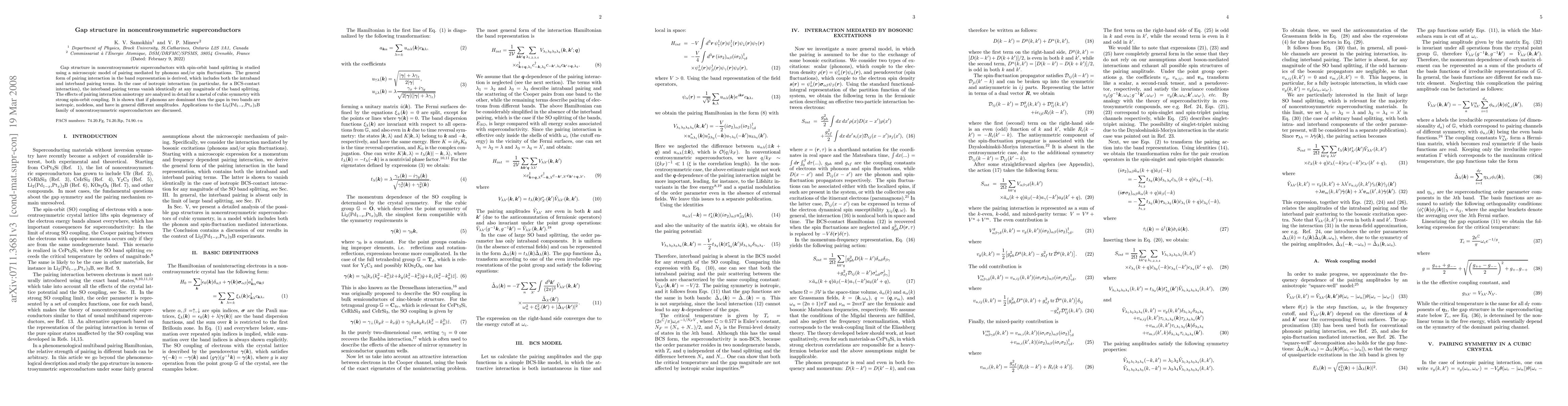 This paper investigates the gap structure in noncentrosymmetric superconductors with spin-orbit band splitting, deriving the pairing interaction form and analyzing its effects, particularly under anisotropic pairing. It concludes that phonon-mediated pairing results in isotropic, nodeless gaps of different amplitudes in two bands, with applications to the Li_2(Pd_{1-x},Pt_x)_3B family.
