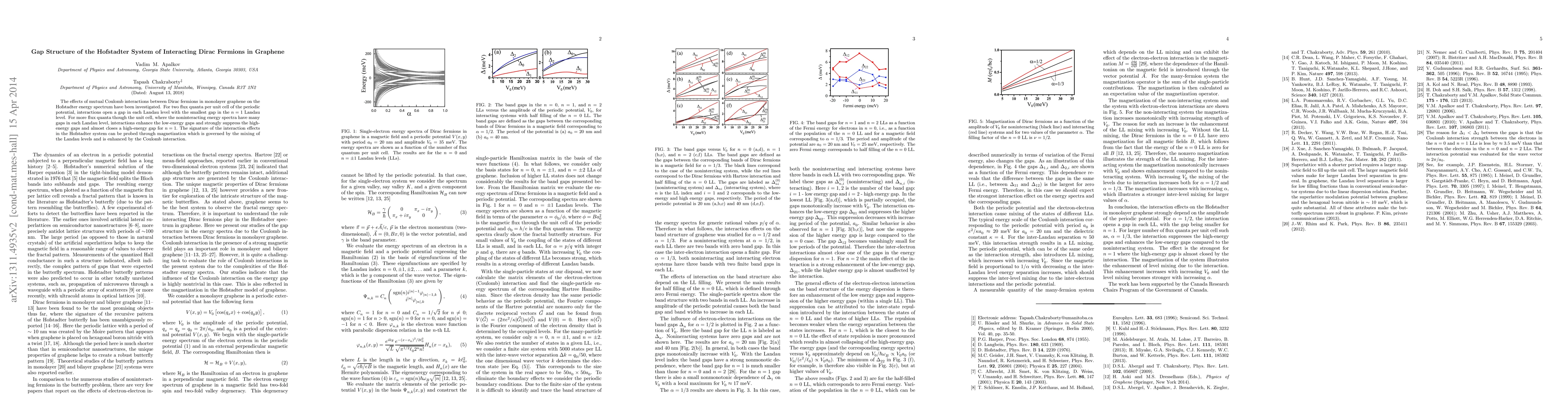 The research examines how Coulomb interactions between Dirac fermions in graphene affect the Hofstadter energy spectrum, finding that interaction effects are minimal for large periodic potential amplitudes but significantly influence the band gap for small amplitudes. Magnetization measurements reveal that Coulomb effects dominate in systems with small periodic potential amplitudes.