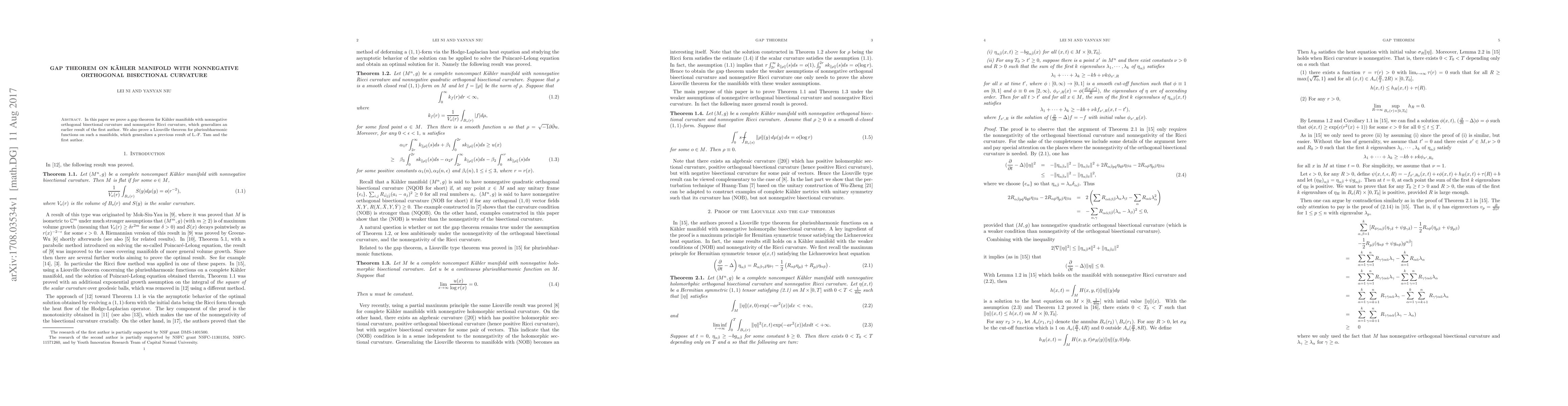 The paper introduces and proves a generalized gap theorem for Kähler manifolds with nonnegative orthogonal bisectional curvature and nonnegative Ricci curvature, along with a Liouville theorem for plurisubharmonic functions.