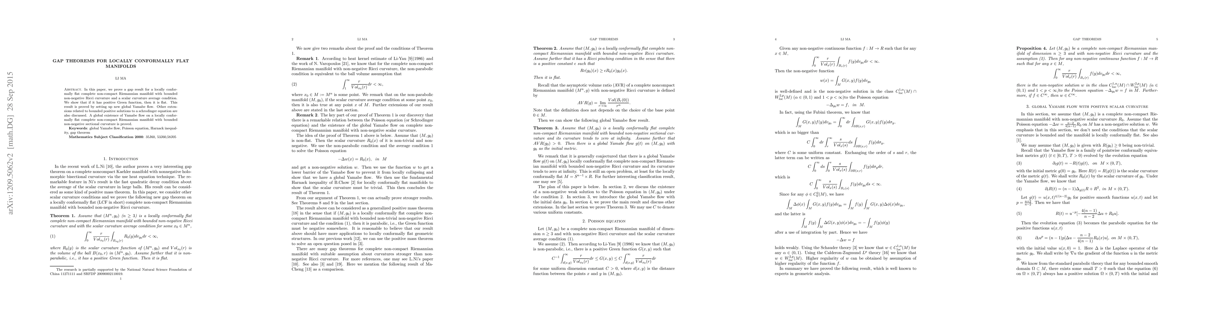 The paper establishes gap theorems for locally conformally flat (LCF) manifolds by introducing a new global Yamabe flow, proving that a complete non-compact Riemannian manifold with bounded non-negative Ricci curvature and a scalar curvature average condition, having a positive Green function, must be flat.