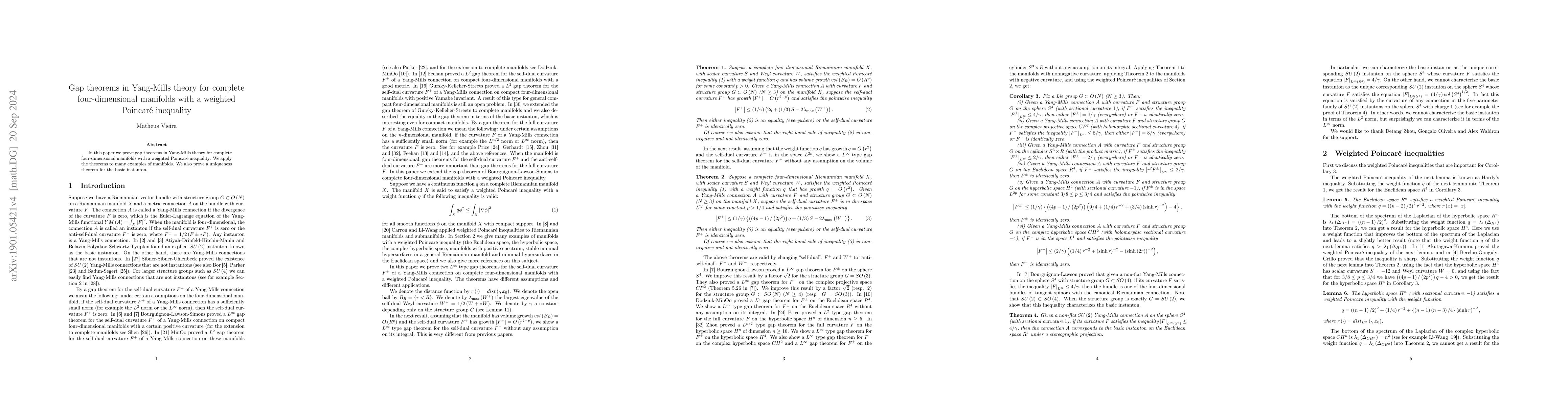 This paper proves gap theorems in Yang-Mills theory for complete four-dimensional manifolds with a weighted Poincaré inequality, applying these results to various examples and establishing a uniqueness theorem for basic instantons.