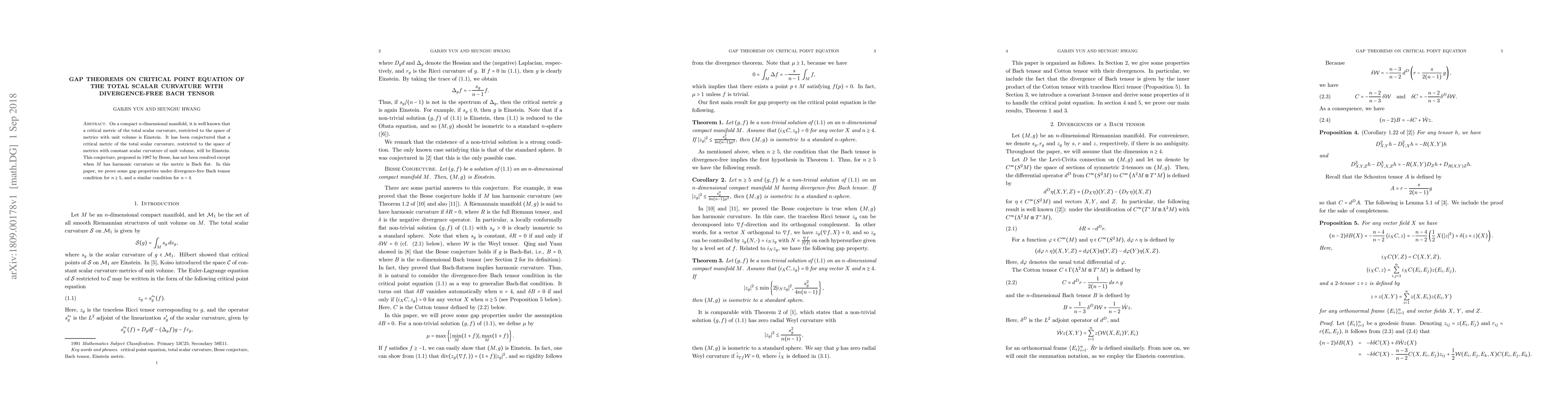 This paper proves gap theorems for critical metrics of the total scalar curvature under the condition of a divergence-free Bach tensor on compact $n$-dimensional manifolds, confirming the conjecture for $n \geq 5$ and providing a similar result for $n=4$. The focus is on metrics with constant scalar curvature of unit volume.