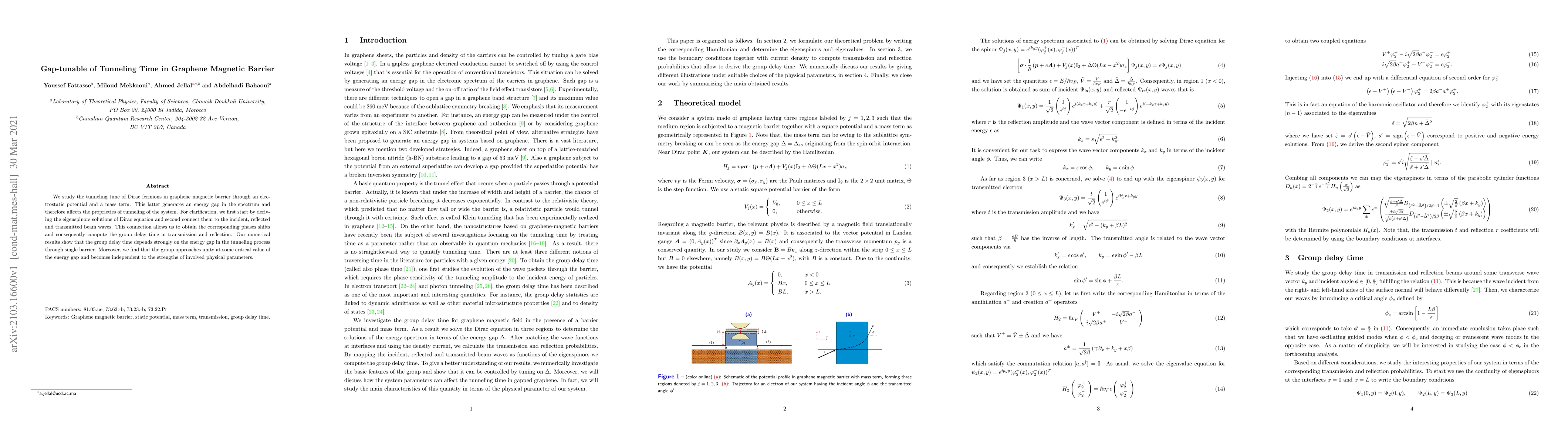 This research investigates the tunneling time of Dirac fermions in a graphene magnetic barrier influenced by an electrostatic potential and a mass term, generating an energy gap. Numerical results indicate that the group delay time in transmission and reflection depends significantly on this energy gap, approaching unity at a critical gap value, and becoming independent of other physical parameters' strengths.
