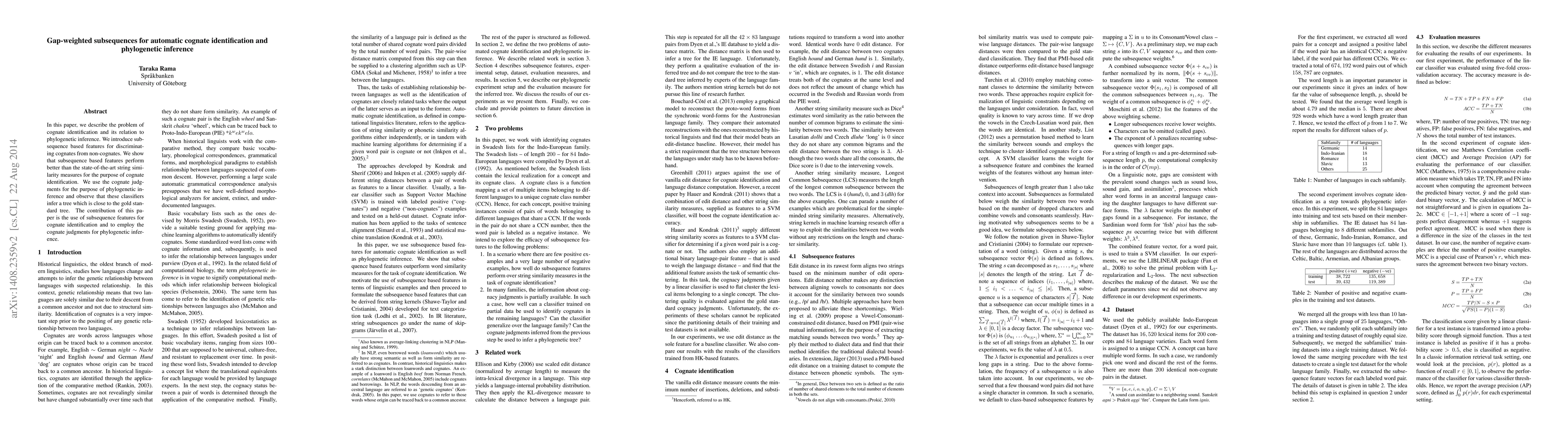 In this paper, we describe the problem of cognate identification and its relation to phylogenetic inference. We introduce subsequence based features for discriminating cognates from non-cognates. We show that subsequence based features perform better than the state-of-the-art string similarity measures for the purpose of cognate identification. We use the cognate judgments for the purpose of phylogenetic inference and observe that these classifiers infer a tree which is close to the gold standard tree. The contribution of this paper is the use of subsequence features for cognate identification and to employ the cognate judgments for phylogenetic inference.