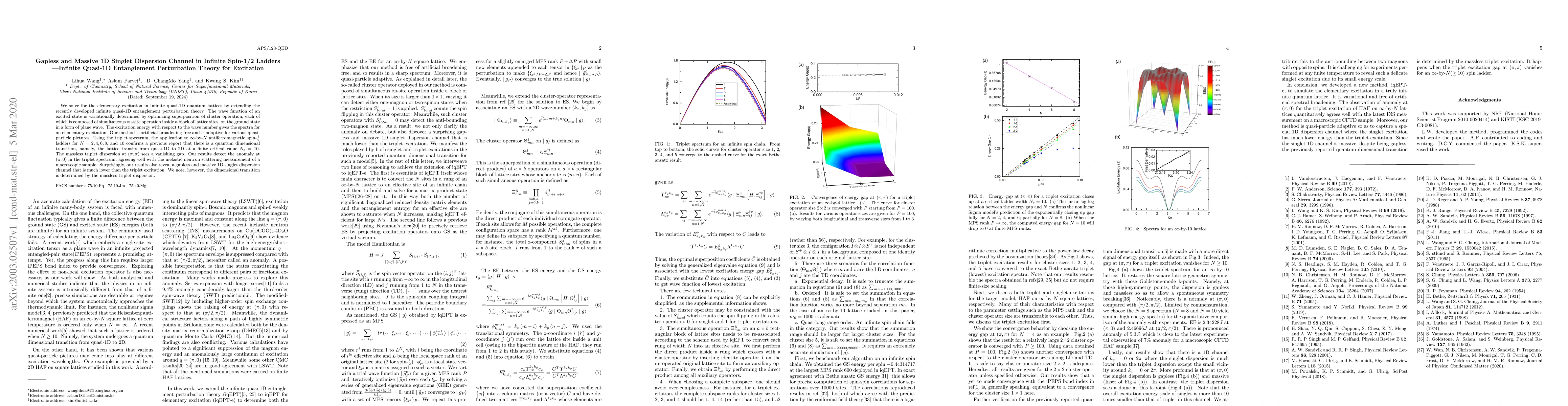 This paper applies infinite quasi-1D entanglement perturbation theory to study elementary excitations in spin-1/2 ladders, revealing a gapless and massive 1D singlet dispersion channel. The findings confirm a dimensional transition from quasi-1D to 2D at $N_c=10$ and detect a vanishing gap at $(\pi, \pi)$ in the triplet spectrum.