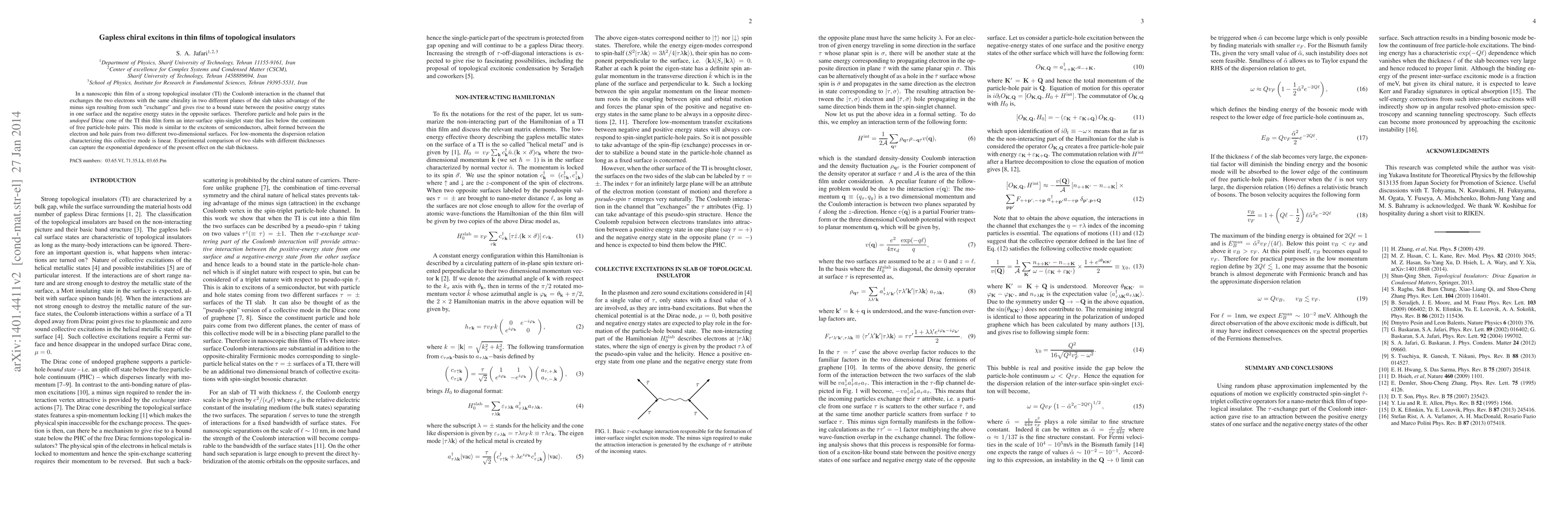 In a nanoscopic thin film of a strong topological insulator (TI) the Coulomb interaction in the channel that exchanges the two electrons with the same chirality in two different planes of the slab takes advantage of the minus sign resulting from such "exchange" and gives rise to a bound state between the positive energy states in one surface and the negative energy states in the opposite surfaces. Therefore particle and hole pairs in the {\em undoped} Dirac cone of the TI thin film form an inter-surface spin-singlet state that lies below the continuum of free particle-hole pairs. This mode is similar to the excitons of semiconductors, albeit formed between the electron and hole pairs from two different two-dimensional surfaces. For low-momenta the dispersion relation characterizing this collective mode is linear. Experimental comparison of two slabs with different thicknesses can capture the exponential dependence of the present effect on the slab thickness.