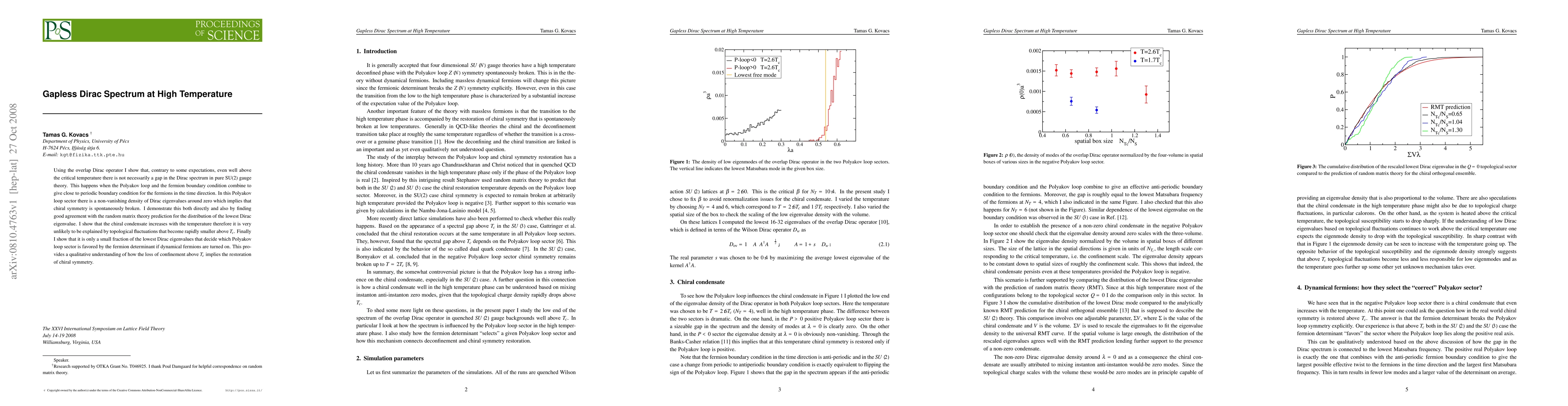 Researchers found that even above the critical temperature, there is no gap in the Dirac spectrum of pure SU(2) gauge theory when a specific combination of Polyakov loop and fermion boundary conditions occurs. This implies spontaneous breaking of chiral symmetry.