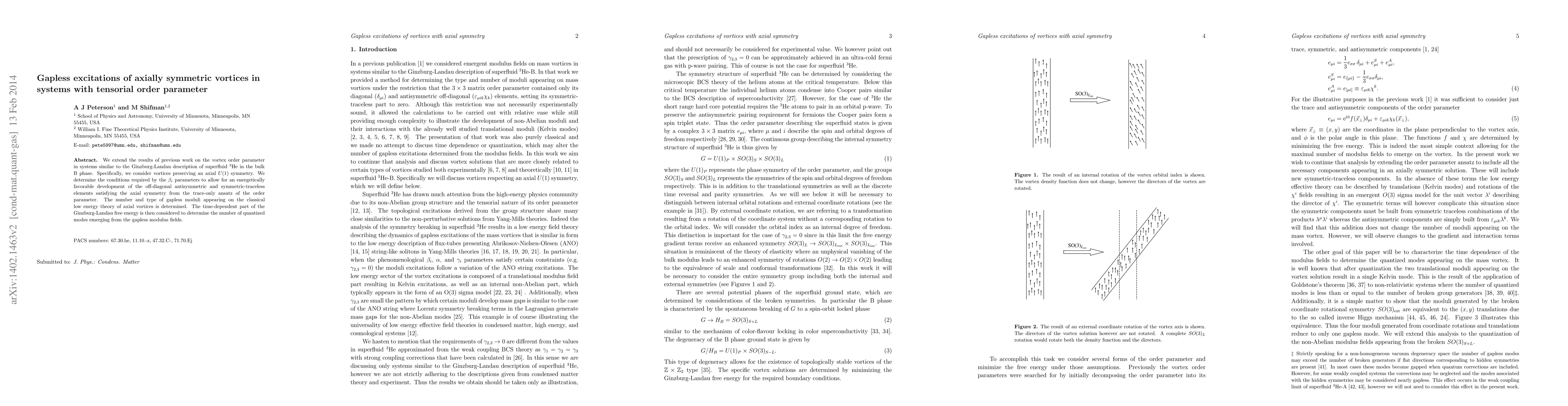 We extend the results of previous work on the vortex order parameter in systems similar to the Ginzburg-Landau description of superfluid $^3$He in the bulk B phase. Specifically, we consider vortices preserving an axial $U(1)$ symmetry. We determine the conditions required by the $\beta_i$ parameters to allow for an energetically favorable development of the off-diagonal antisymmetric and symmetric-traceless elements satisfying the axial symmetry from the trace-only ansatz of the order parameter. The number and type of gapless moduli appearing on the classical low energy theory of axial vortices is determined. The time-dependent part of the Ginzburg-Landau free energy is then considered to determine the number of quantized modes emerging from the gapless moduli fields.