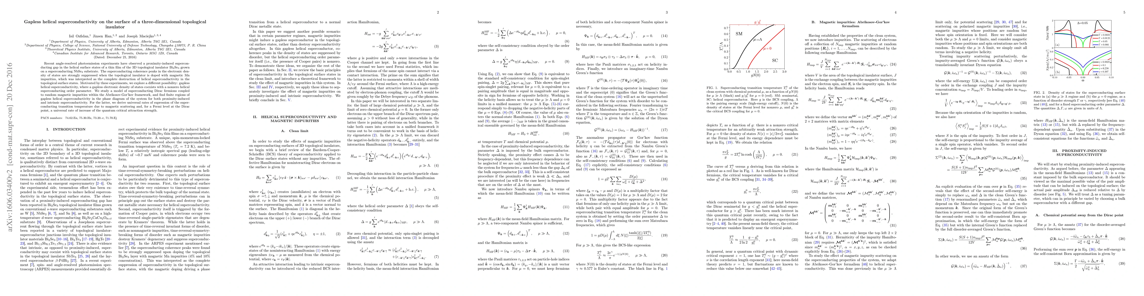 This paper investigates the possibility of gapless helical superconductivity on the surface of a topological insulator, finding regions where a gapless electronic density coexists with a helical superconducting order parameter. It derives universal rates for the suppression of superconductivity due to magnetic impurities and the enhancement of quantum critical attraction strength.