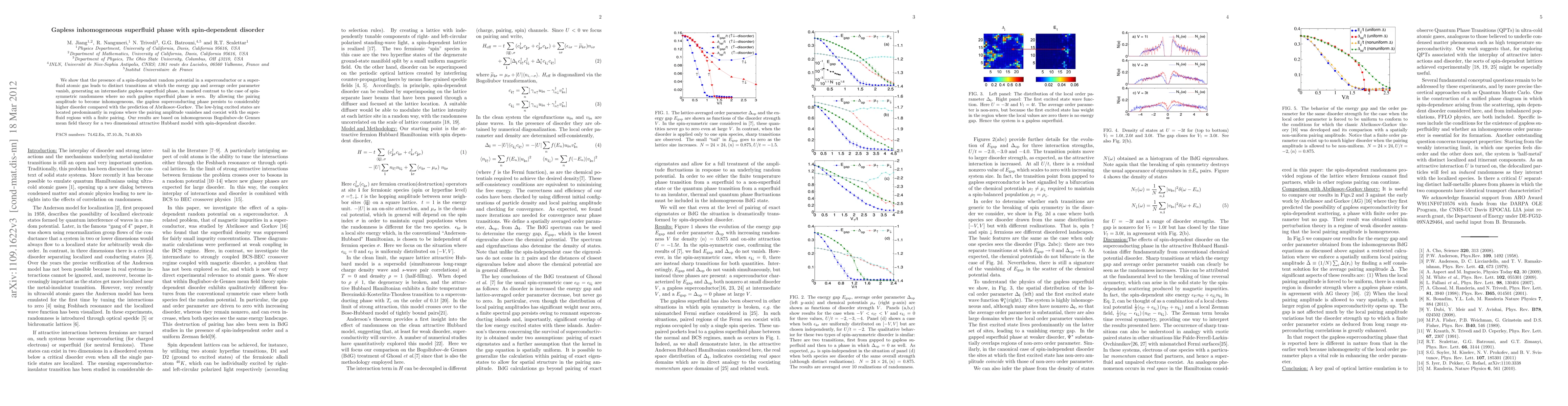 We show that the presence of a spin-dependent random potential in a superconductor or a superfluid atomic gas leads to distinct transitions at which the energy gap and average order parameter vanish, generating an intermediate gapless superfluid phase, in marked contrast to the case of spin-symmetric randomness where no such gapless superfluid phase is seen. By allowing the pairing amplitude to become inhomogeneous, the gapless superconducting phase persists to considerably higher disorder compared with the prediction of Abrikosov-Gorkov. The low-lying excited states are located predominantly in regions where the pairing amplitude vanishes and coexist with the superfluid regions with a finite pairing. Our results are based on inhomogeneous Bogoliubov-de Gennes mean field theory for a two dimensional attractive Hubbard model with spin-dependent disorder.