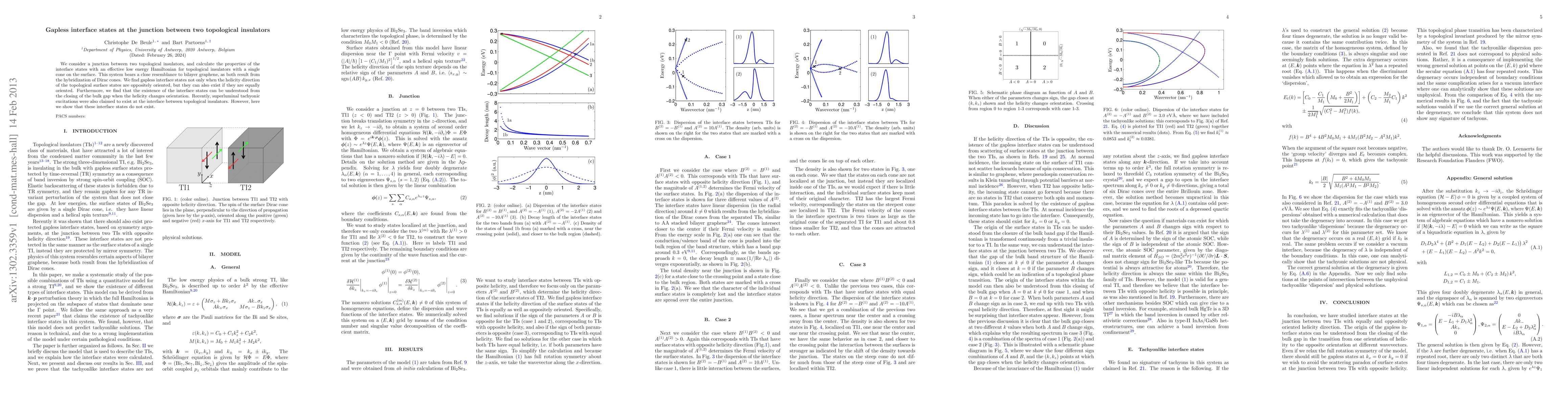 This paper investigates the interface states at the junction between two topological insulators, revealing gapless states even when the helicity direction of the surface states is the same. It clarifies that superluminal tachyonic excitations do not exist at these interfaces.