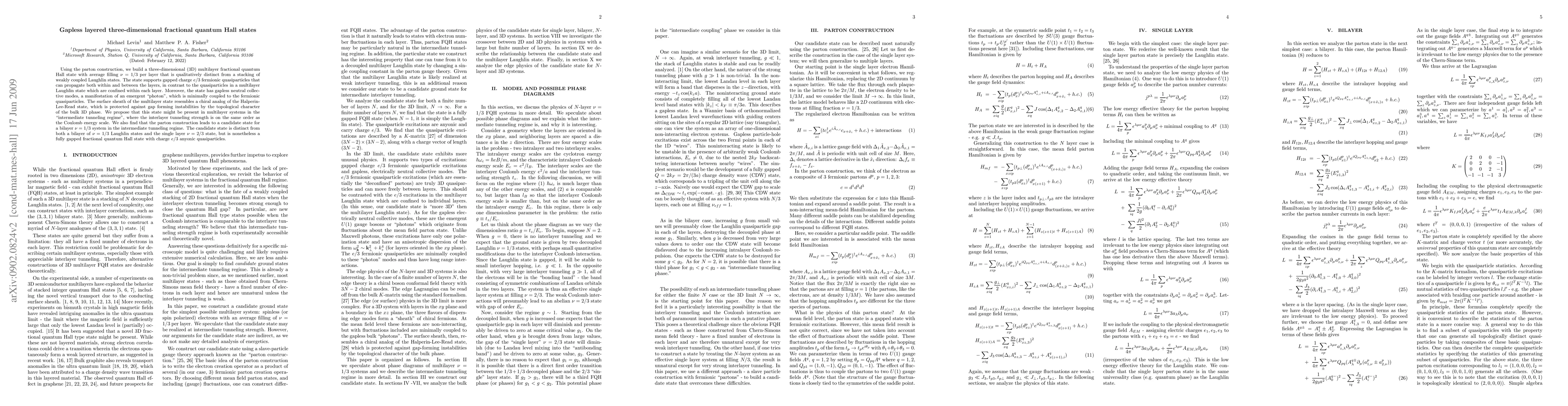 Using the parton construction, we build a three-dimensional (3D) multilayer fractional quantum Hall state with average filling \nu = 1/3 per layer that is qualitatively distinct from a stacking of weakly coupled Laughlin states. The state supports gapped charge e/3 fermionic quasiparticles that can propagate both within and between the layers, in contrast to the quasiparticles in a multilayer Laughlin state which are confined within each layer. Moreover, the state has gapless neutral collective modes, a manifestation of an emergent "photon", which is minimally coupled to the fermionic quasiparticles. The surface sheath of the multilayer state resembles a chiral analog of the Halperin-Lee-Read state, which is protected against gap forming instabilities by the topological character of the bulk 3D phase. We propose that this state might be present in multilayer systems in the "intermediate tunneling regime", where the interlayer tunneling strength is on the same order as the Coulomb energy scale. We also find that the parton construction leads to a candidate state for a bilayer \nu = 1/3 system in the intermediate tunneling regime. The candidate state is distinct from both a bilayer of \nu=1/3 Laughlin states and the single layer \nu = 2/3 state, but is nonetheless a fully gapped fractional quantum Hall state with charge e/3 anyonic quasiparticles.