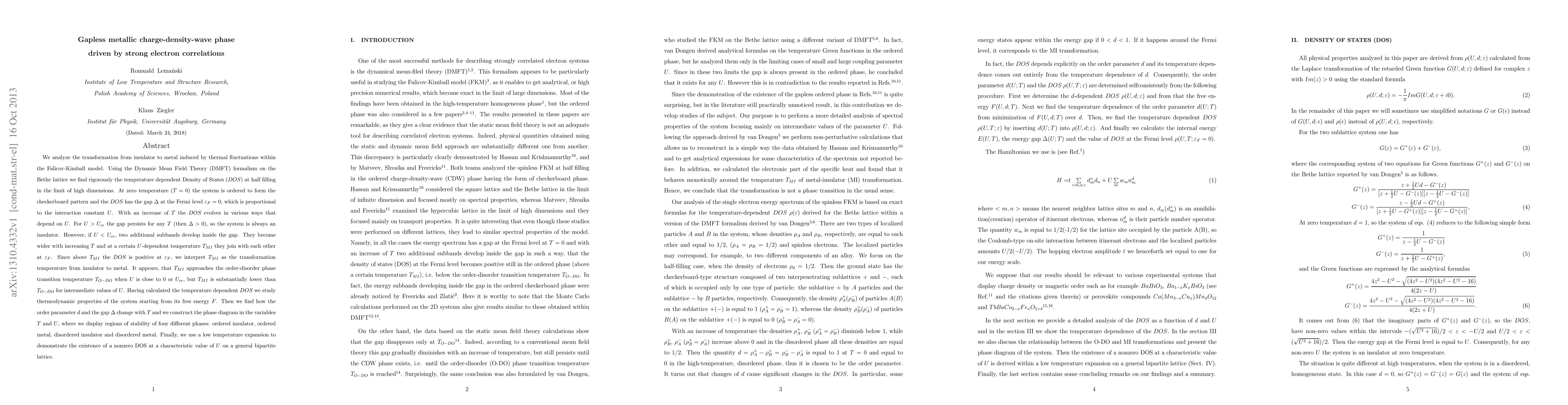 We analyze the transformation from insulator to metal induced by thermal fluctuations within the Falicov-Kimball model. Using the Dynamic Mean Field Theory (DMFT) formalism on the Bethe lattice we find rigorously the temperature dependent Density of States ($DOS$) at half filling in the limit of high dimensions. At zero temperature (T=0) the system is ordered to form the checkerboard pattern and the $DOS$ has the gap $\Delta$ at the Fermi level $\varepsilon_F=0$, which is proportional to the interaction constant $U$. With an increase of $T$ the $DOS$ evolves in various ways that depend on $U$. For $U>U_{cr}$ the gap persists for any $T$ (then $\Delta >0$), so the system is always an insulator. However, if $U < U_{cr}$, two additional subbands develop inside the gap. They become wider with increasing $T$ and at a certain $U$-dependent temperature $T_{MI}$ they join with each other at $\varepsilon_F$. Since above $T_{MI}$ the $DOS$ is positive at $\varepsilon_F$, we interpret $T_{MI}$ as the transformation temperature from insulator to metal. It appears, that $T_{MI}$ approaches the order-disorder phase transition temperature $T_{O-DO}$ when $U$ is close to 0 or $ U_{cr}$, but $T_{MI}$ is substantially lower than $T_{O-DO}$ for intermediate values of $U$. Having calculated the temperature dependent $DOS$ we study thermodynamic properties of the system starting from its free energy $F$. Then we find how the order parameter $d$ and the gap $\Delta $ change with $T$ and we construct the phase diagram in the variables $T$ and $U$, where we display regions of stability of four different phases: ordered insulator, ordered metal, disordered insulator and disordered metal. Finally, we use a low temperature expansion to demonstrate the existence of a nonzero DOS at a characteristic value of U on a general bipartite lattice.