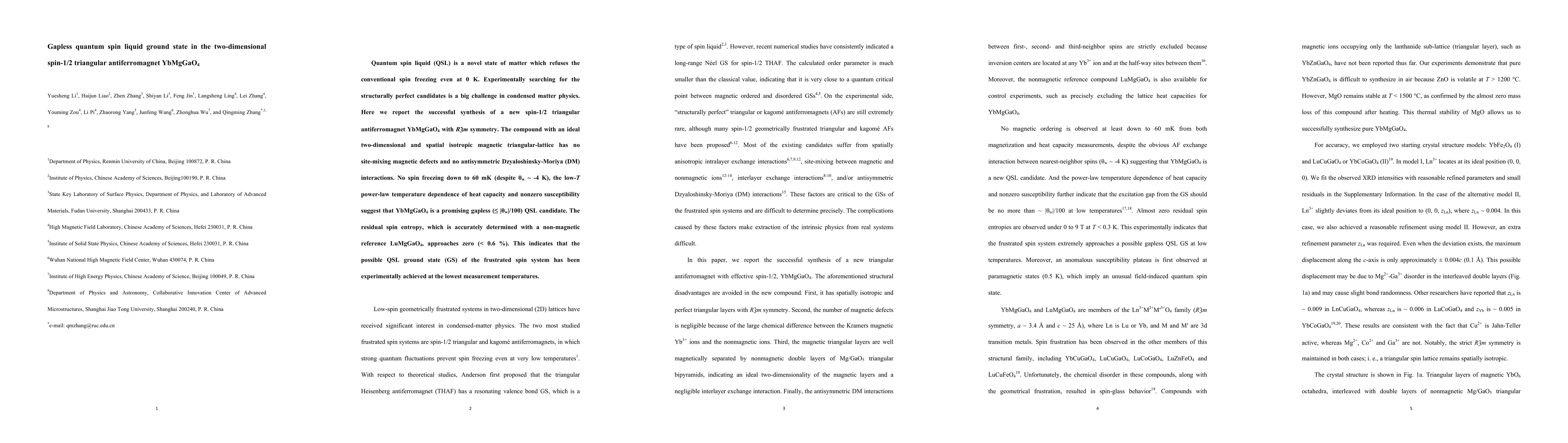 This paper reports the synthesis of YbMgGaO$_4$, a two-dimensional spin-1/2 triangular antiferromagnet, which exhibits no spin freezing down to 60 mK, suggesting it is a promising gapless quantum spin liquid ground state. The compound's residual spin entropy approaches zero, indicating the experimental realization of a frustrated spin system's quantum spin liquid state.