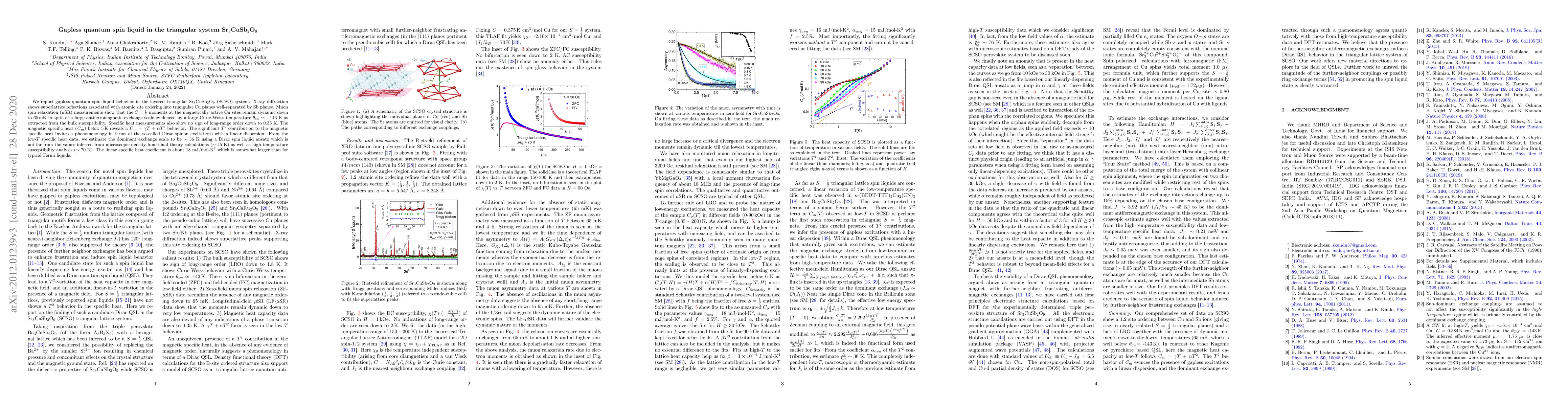 We report gapless quantum spin liquid behavior in the layered triangular Sr$_{3}$CuSb$_{2}$O$_{9}$ (SCSO) system. X-ray diffraction shows superlattice reflections associated with atomic site ordering into triangular Cu planes well-separated by Sb planes. Muon spin relaxation ($\mu$SR) measurements show that the $S = \frac{1}{2}$ moments at the magnetically active Cu sites remain dynamic down to 65 mK in spite of a large antiferromagnetic exchange scale evidenced by a large Curie-Weiss temperature $\theta_{\mathrm{cw}} \simeq $ -143 K as extracted from the bulk susceptibility. Specific heat measurements also show no sign of long-range order down to 0.35 K. The magnetic specific heat ($\mathit{C}$$_{\mathrm{m}}$) below 5 K reveals a $\mathit{C}$$_{\mathrm{m}}$ $=$ $\gamma T$ + $\alpha T$$^{2}$ behavior. The significant $T$$^{2}$ contribution to the magnetic specific heat invites a phenomenology in terms of the so-called Dirac spinon excitations with a linear dispersion. From the low-$T$ specific heat data, we estimate the dominant exchange scale to be $\sim $ 36 K using a Dirac spin liquid ansatz which is not far from the values inferred from microscopic density functional theory calculations ($\sim $ 45 K) as well as high-temperature susceptibility analysis ($\sim$ 70 K). The linear specific heat coefficient is about 18 mJ/mol-K$^2$ which is somewhat larger than for typical Fermi liquids.
