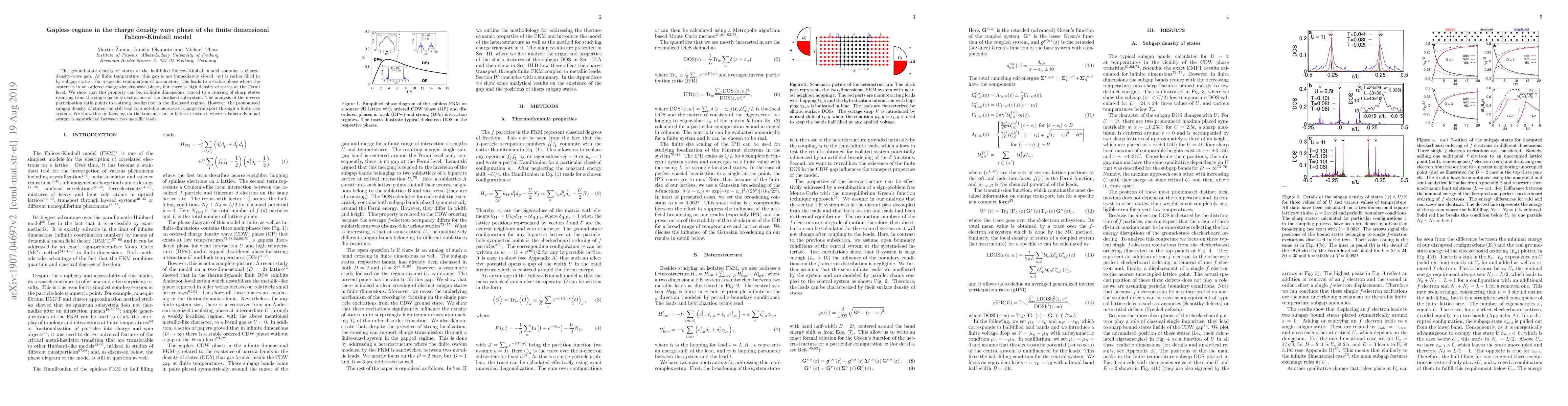 The ground-state density of states of the half-filled Falicov-Kimball model contains a charge-density-wave gap. At finite temperature, this gap is not immediately closed, but is rather filled in by subgap states. For a specific combination of parameters, this leads to a stable phase where the system is in an ordered charge-density-wave phase, but there is high density of states at the Fermi level. We show that this property can be, in finite dimensions, traced to a crossing of sharp states resulting from the single particle excitations of the localized subsystem. The analysis of the inverse participation ratio points to a strong localization in the discussed regime. However, the pronounced subgap density of states can still lead to a notable increase of charge transport through a finite size system. We show this by focusing on the transmission in heterostructures where a Falicov-Kimball system is sandwiched between two metallic leads.
