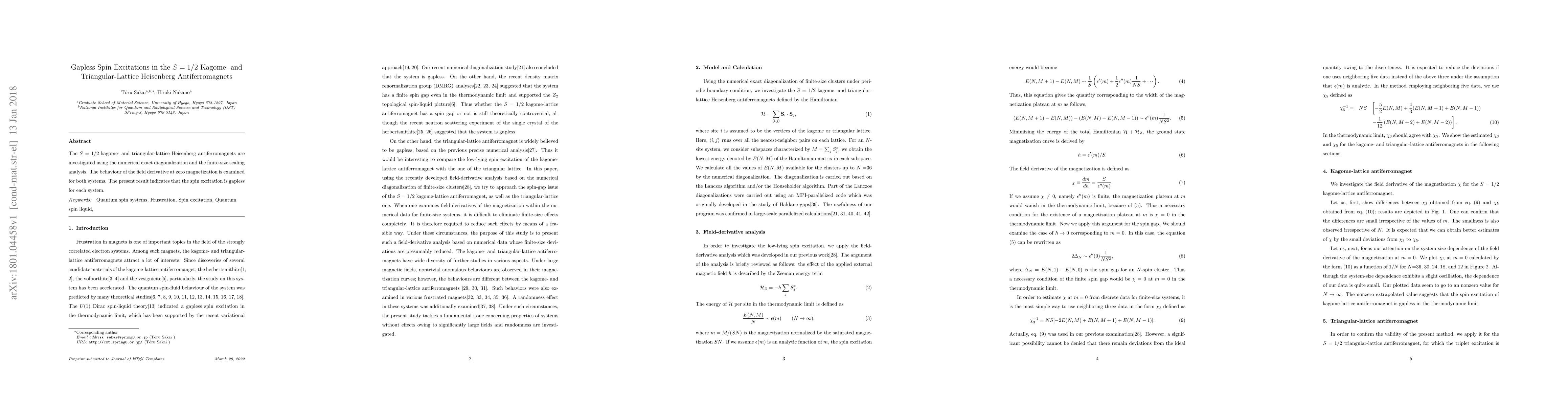 This study reveals that both the $S=1/2$ kagome- and triangular-lattice Heisenberg antiferromagnets exhibit gapless spin excitations, as demonstrated through numerical exact diagonalization and finite-size scaling analysis. The field derivative behavior at zero magnetization confirms the absence of a gap in spin excitations for these systems.