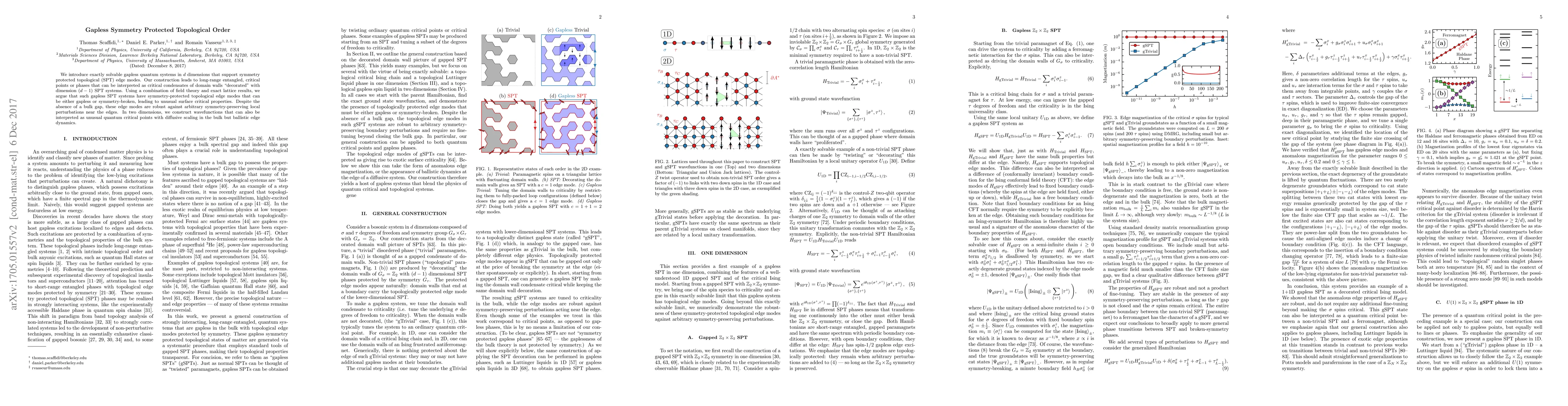 This paper introduces gapless quantum systems in $d$ dimensions with symmetry protected topological order, featuring robust edge modes that can be either gapless or symmetry-broken. The study combines field theory and exact lattice models to demonstrate unusual critical properties with diffusive bulk scaling and ballistic edge dynamics.