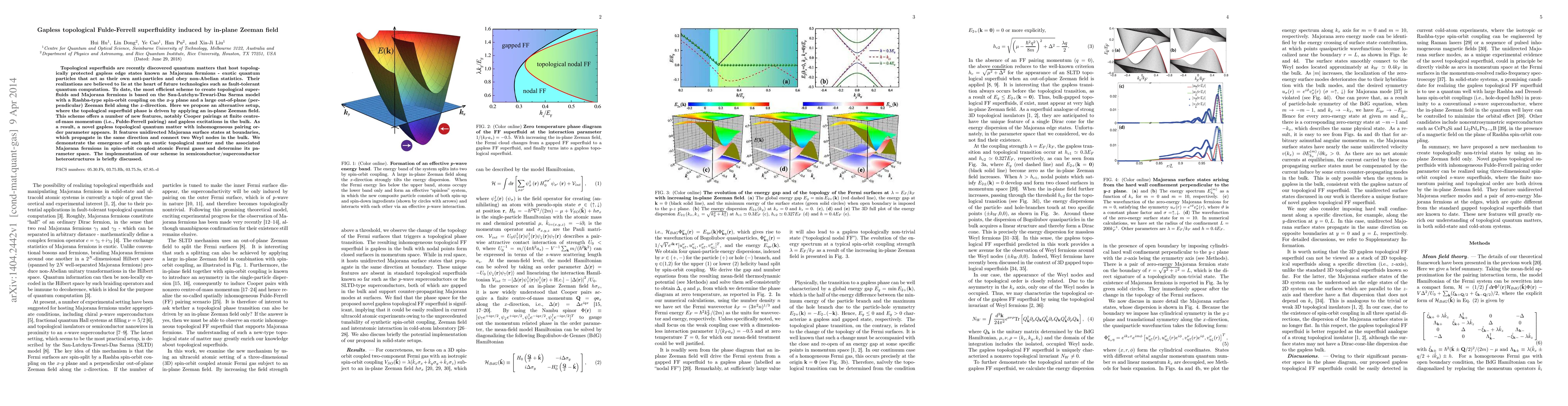 This paper proposes a new topological superfluid phase induced by an in-plane Zeeman field, characterized by gapless topological excitations and Fulde-Ferrell pairing. It demonstrates Majorana fermions and unidirected surface states in spin-orbit coupled Fermi gases and discusses potential implementations in semiconductor/superconductor heterostructures.