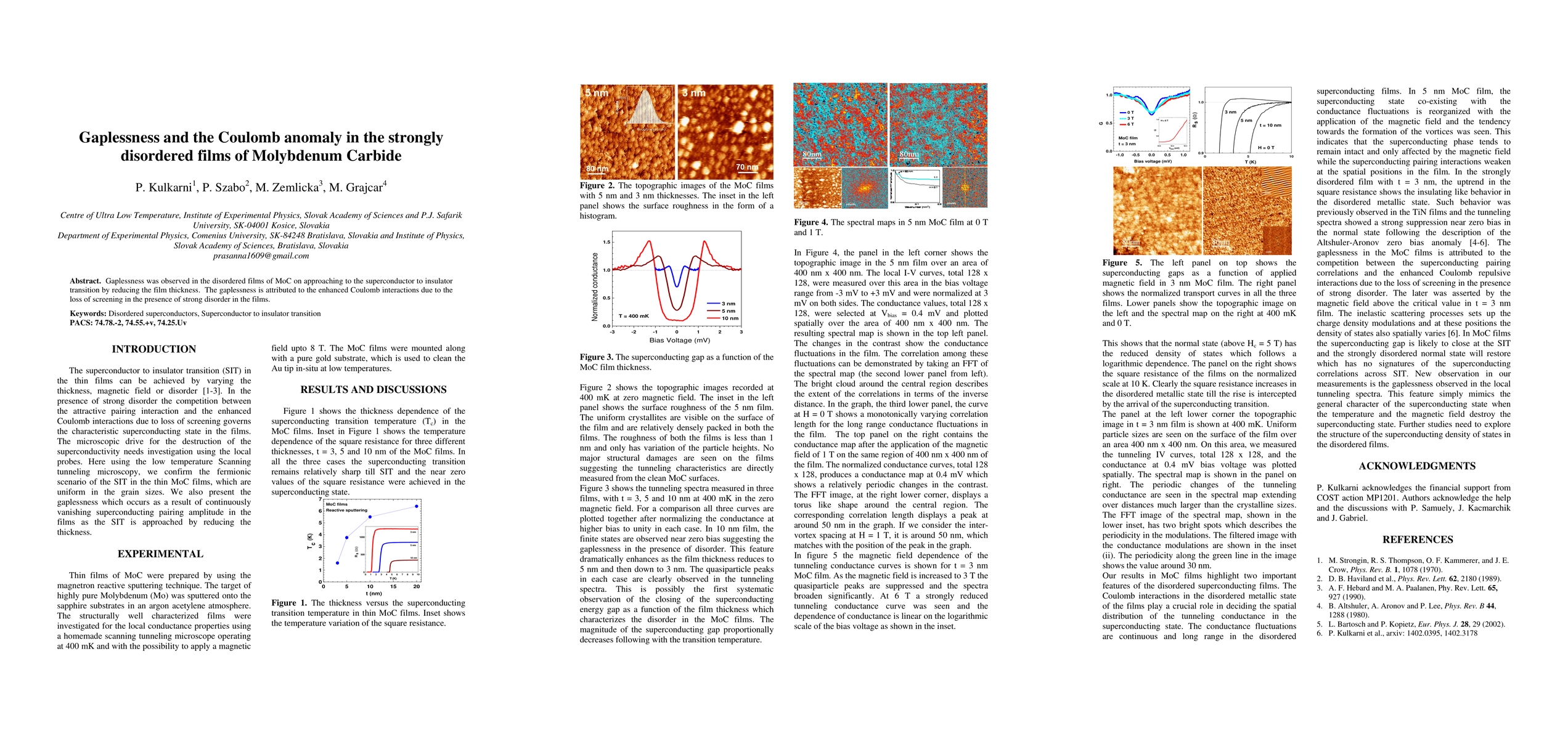 The study found gapless behavior in strongly disordered MoC films near the superconductor to insulator transition, attributing this to increased Coulomb interactions caused by diminished screening due to disorder.