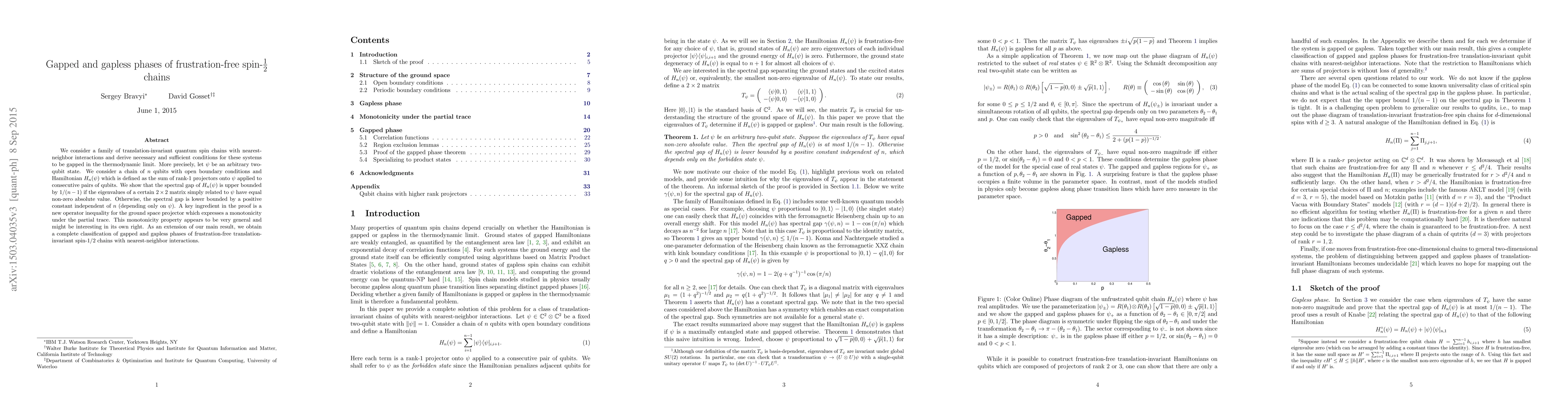 We consider a family of translation-invariant quantum spin chains with nearest-neighbor interactions and derive necessary and sufficient conditions for these systems to be gapped in the thermodynamic limit. More precisely, let $\psi$ be an arbitrary two-qubit state. We consider a chain of $n$ qubits with open boundary conditions and Hamiltonian $H_n(\psi)$ which is defined as the sum of rank-1 projectors onto $\psi$ applied to consecutive pairs of qubits. We show that the spectral gap of $H_n(\psi)$ is upper bounded by $1/(n-1)$ if the eigenvalues of a certain two-by-two matrix simply related to $\psi$ have equal non-zero absolute value. Otherwise, the spectral gap is lower bounded by a positive constant independent of $n$ (depending only on $\psi$). A key ingredient in the proof is a new operator inequality for the ground space projector which expresses a monotonicity under the partial trace. This monotonicity property appears to be very general and might be interesting in its own right. As an extension of our main result, we obtain a complete classification of gapped and gapless phases of frustration-free translation-invariant spin-1/2 chains with nearest-neighbor interactions.