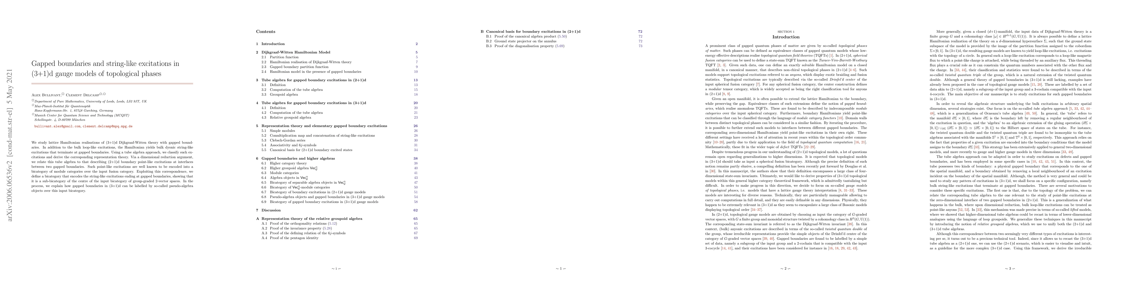 This paper investigates lattice Hamiltonian models of (3+1)d Dijkgraaf-Witten theory with gapped boundaries, revealing bulk dyonic string-like excitations terminating at these boundaries. It uses a tube algebra approach to classify these excitations and relates them to point-like excitations at interfaces between two gapped boundaries in (2+1)d.