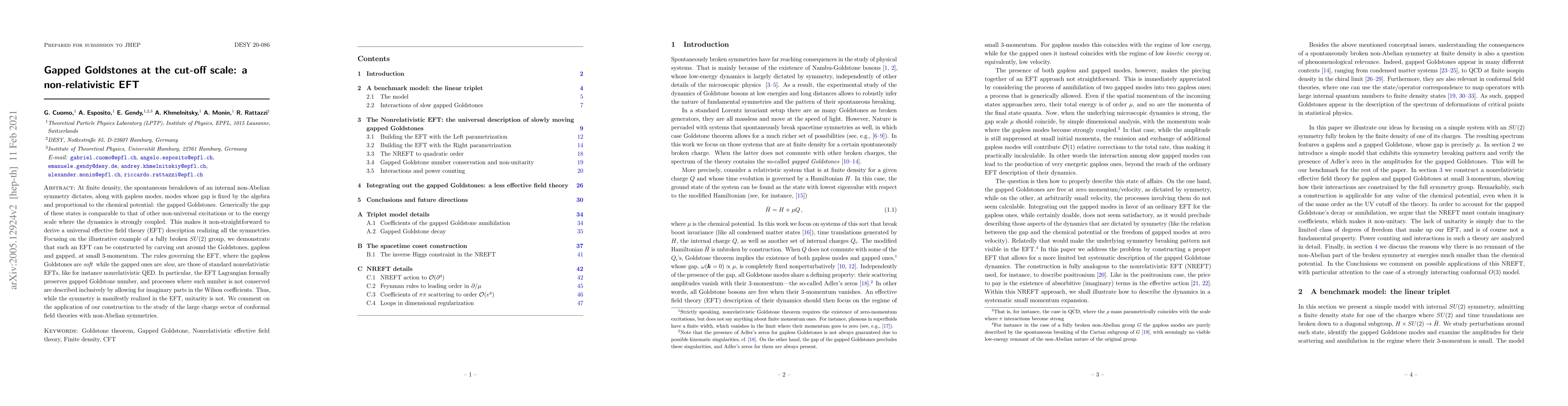 At finite density, the spontaneous breakdown of an internal non-Abelian symmetry dictates, along with gapless modes, modes whose gap is fixed by the algebra and proportional to the chemical potential: the gapped Goldstones. Generically the gap of these states is comparable to that of other non-universal excitations or to the energy scale where the dynamics is strongly coupled. This makes it non-straightforward to derive a universal ef effective field theory (EFT) description realizing all the symmetries. Focusing on the illustrative example of a fully broken SU (2) group, we demonstrate that such an EFT can be constructed by carving out around the Goldstones, gapless and gapped, at small 3-momentum. The rules governing the EFT, where the gapless Goldstones are soft while the gapped ones are slow, are those of standard nonrelativistic EFTs, like for instance nonrelativistic QED. In particular, the EFT Lagrangian formally preserves gapped Goldstone number, and processes where such number is not conserved are described inclusively by allowing for imaginary parts in the Wilson coefficients. Thus, while the symmetry is manifestly realized in the EFT, unitarity is not. We comment on the application of our construction to the study of the large charge sector of conformal field theories with non-Abelian symmetries.