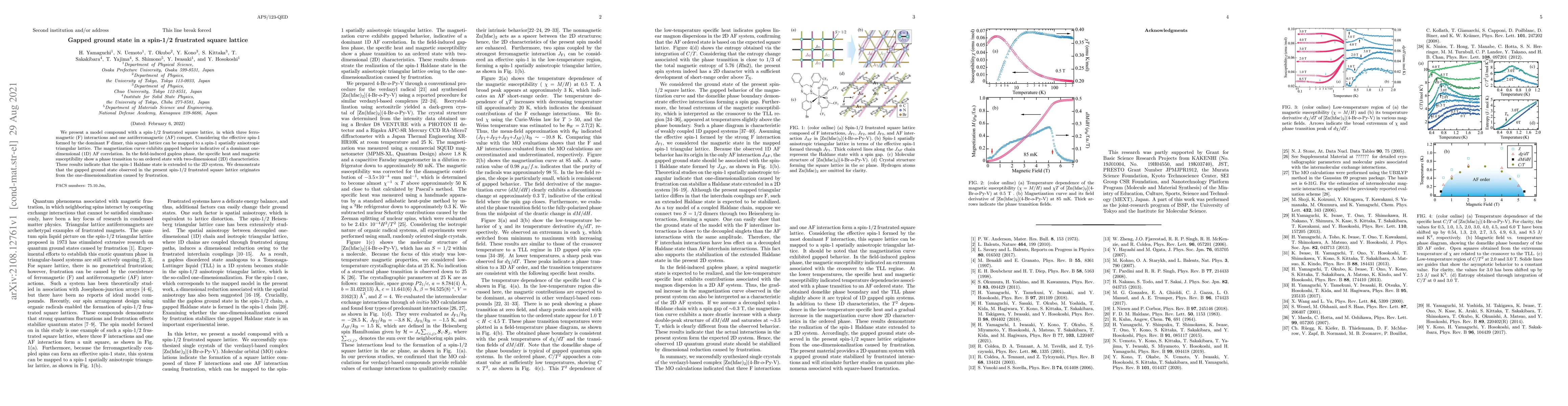We present a model compound with a spin-1/2 frustrated square lattice, in which three ferromagnetic (F) interactions and one antiferromagnetic (AF) compet. Considering the effective spin-1 formed by the dominant F dimer, this square lattice can be mapped to a spin-1 spatially anisotropic triangular lattice. The magnetization curve exhibits gapped behavior indicative of a dominant one-dimensional (1D) AF correlation. In the field-induced gapless phase, the specific heat and magnetic susceptibility show a phase transition to an ordered state with 2D characteristics. These results indicate that the spin-1 Haldane state is extended to the 2D system. We demonstrate that the gapped ground state observed in the present spin-1/2 frustrated square lattice originates from the one-dimensionalization caused by frustration.
