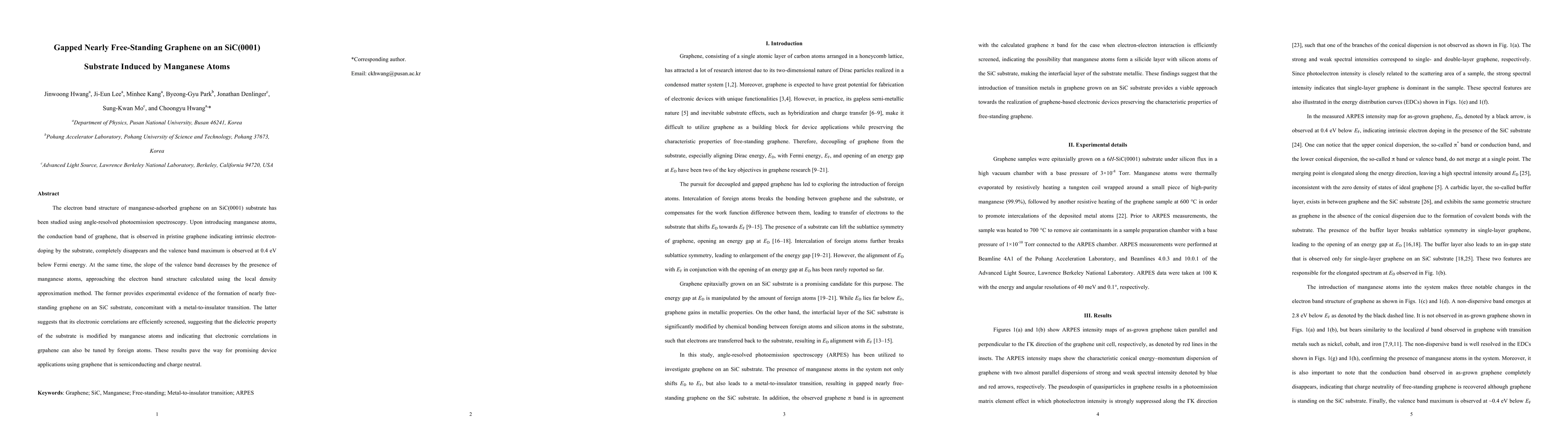 The electron band structure of manganese-adsorbed graphene on an SiC(0001) substrate has been studied using angle-resolved photoemission spectroscopy. Upon introducing manganese atoms, the conduction band of graphene completely disappears and the valence band maximum is observed at 0.4 eV below Fermi energy. At the same time, the slope of the valence band decreases, approaching the electron band structure calculated using the local density approximation method. While the former provides experimental evidence of the formation of nearly free-standing graphene on an SiC substrate, concomitant with a metal-to-insulator transition, the latter suggests that its electronic correlations can be modified by foreign atoms. These results pave the way for promising device applications using graphene that is semiconducting and charge neutral.