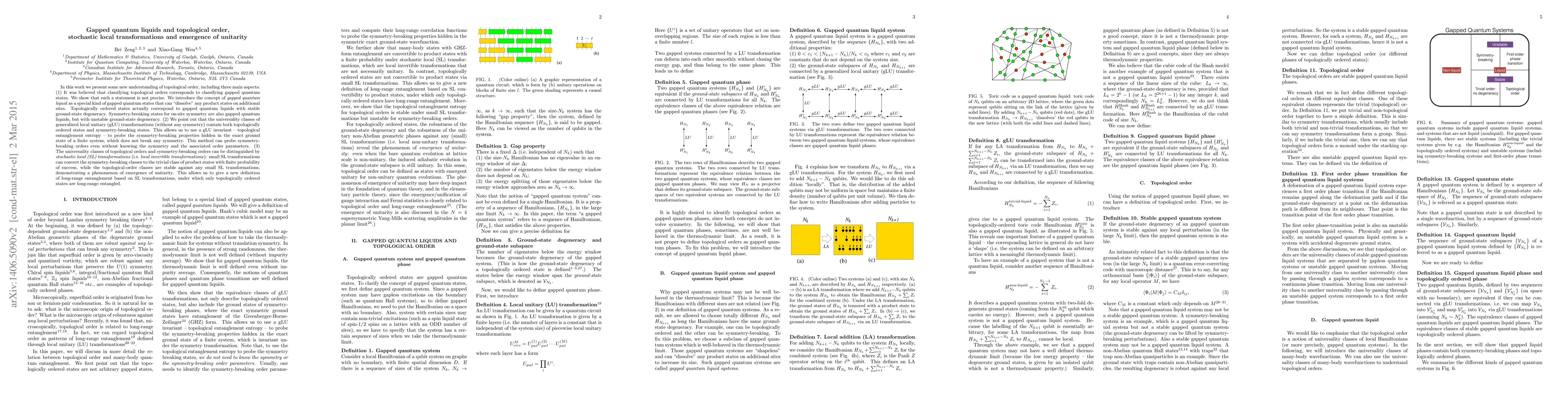 In this work we present some new understanding of topological order, including three main aspects: (1) It was believed that classifying topological orders corresponds to classifying gapped quantum states. We show that such a statement is not precise. We introduce the concept of \emph{gapped quantum liquid} as a special kind of gapped quantum states that can "dissolve" any product states on additional sites. Topologically ordered states actually correspond to gapped quantum liquids with stable ground-state degeneracy. Symmetry-breaking states for on-site symmetry are also gapped quantum liquids, but with unstable ground-state degeneracy. (2) We point out that the universality classes of generalized local unitary (gLU) transformations (without any symmetry) contain both topologically ordered states and symmetry-breaking states. This allows us to use a gLU invariant -- topological entanglement entropy -- to probe the symmetry-breaking properties hidden in the exact ground state of a finite system, which does not break any symmetry. This method can probe symmetry- breaking orders even without knowing the symmetry and the associated order parameters. (3) The universality classes of topological orders and symmetry-breaking orders can be distinguished by \emph{stochastic local (SL) transformations} (i.e.\ \emph{local invertible transformations}): small SL transformations can convert the symmetry-breaking classes to the trivial class of product states with finite probability of success, while the topological-order classes are stable against any small SL transformations, demonstrating a phenomenon of emergence of unitarity. This allows us to give a new definition of long-range entanglement based on SL transformations, under which only topologically ordered states are long-range entangled.