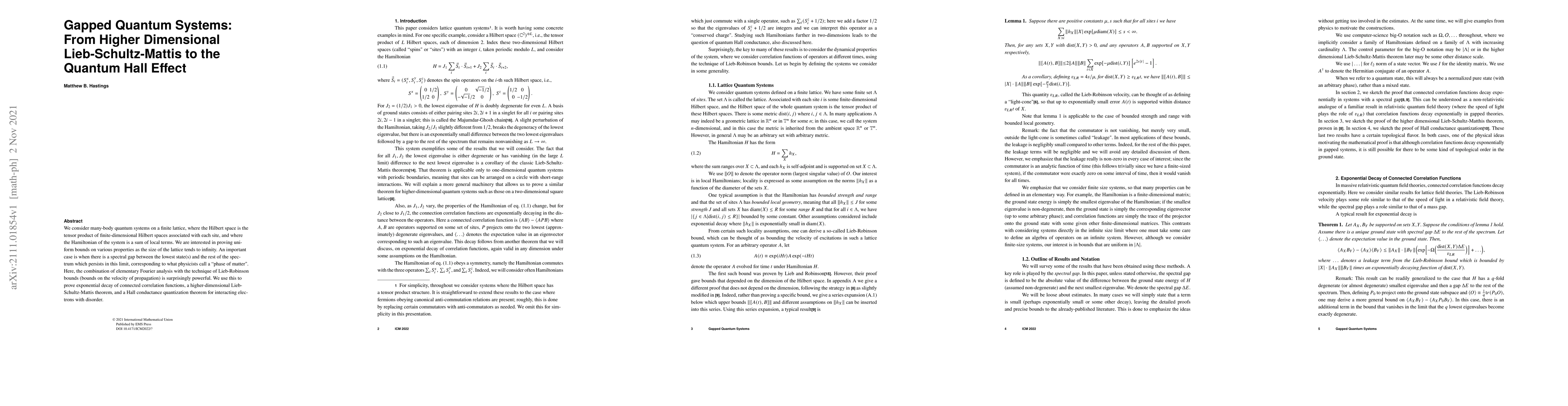 We consider many-body quantum systems on a finite lattice, where the Hilbert space is the tensor product of finite-dimensional Hilbert spaces associated with each site, and where the Hamiltonian of the system is a sum of local terms. We are interested in proving uniform bounds on various properties as the size of the lattice tends to infinity. An important case is when there is a spectral gap between the lowest state(s) and the rest of the spectrum which persists in this limit, corresponding to what physicists call a ``phase of matter". Here, the combination of elementary Fourier analysis with the technique of Lieb-Robinson bounds (bounds on the velocity of propagation) is surprisingly powerful. We use this to prove exponential decay of connected correlation functions, a higher-dimensional Lieb-Schultz-Mattis theorem, and a Hall conductance quantization theorem for interacting electrons with disorder.