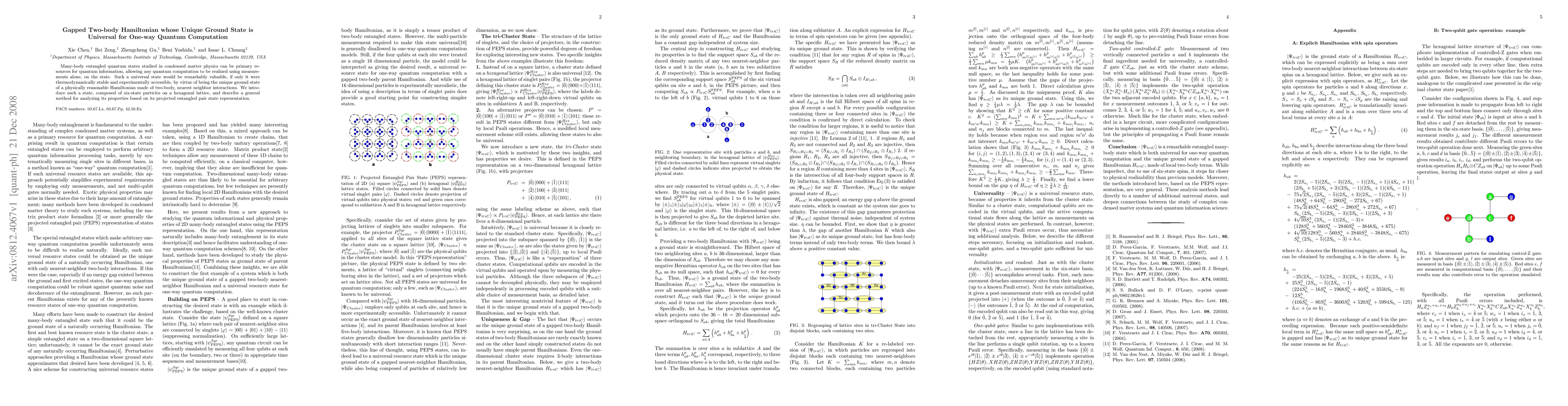 This paper introduces a unique ground state of a gapped two-body Hamiltonian on a hexagonal lattice, which is universal for one-way quantum computation. The authors analyze its properties using a projected entangled pair state representation and discuss its potential for quantum information processing.