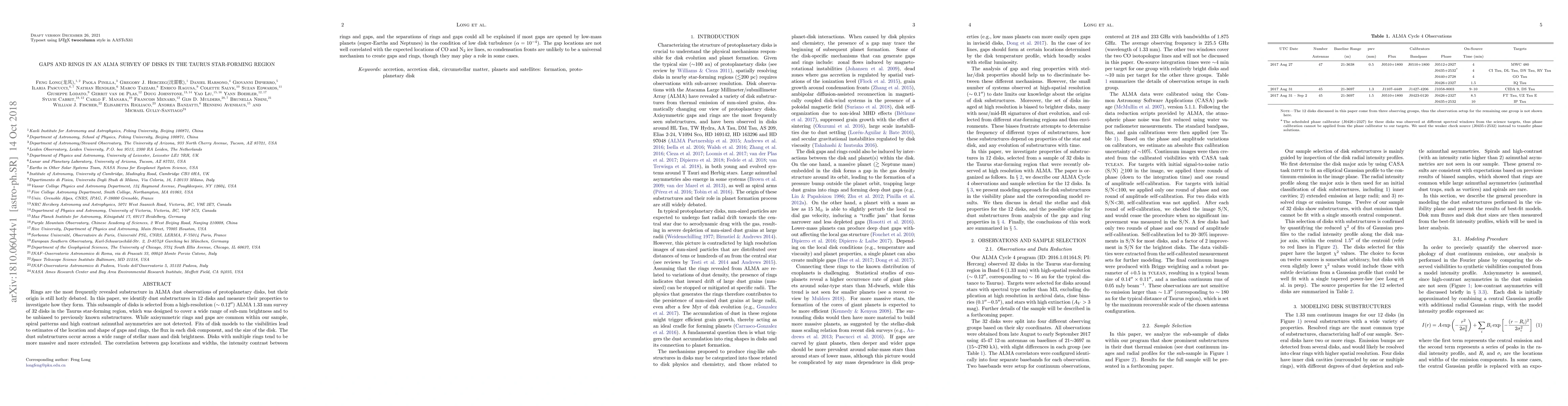 This ALMA survey of protoplanetary disks in the Taurus region identifies dust substructures in 12 disks, revealing that axisymmetric rings and gaps are common but not spiral patterns. The study suggests that low-mass planets may be responsible for the gaps, rather than condensation fronts, and that these features occur across a wide range of stellar mass and disk brightness.