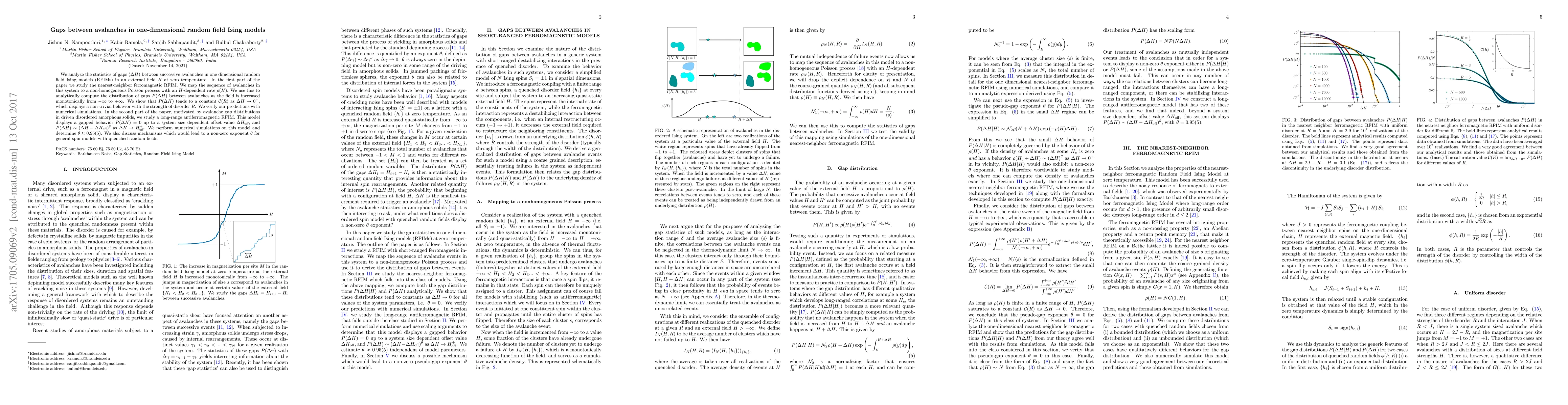This paper investigates the statistical distribution of gaps between successive avalanches in one-dimensional random field Ising models (RFIMs) at zero temperature. It analytically computes the distribution for the nearest-neighbour ferromagnetic RFIM and numerically verifies it, showing a non-trivial dependence on the disorder strength. It also studies a long-range antiferromagnetic RFIM, finding a gapped behavior and determining the exponent governing the gap distribution.