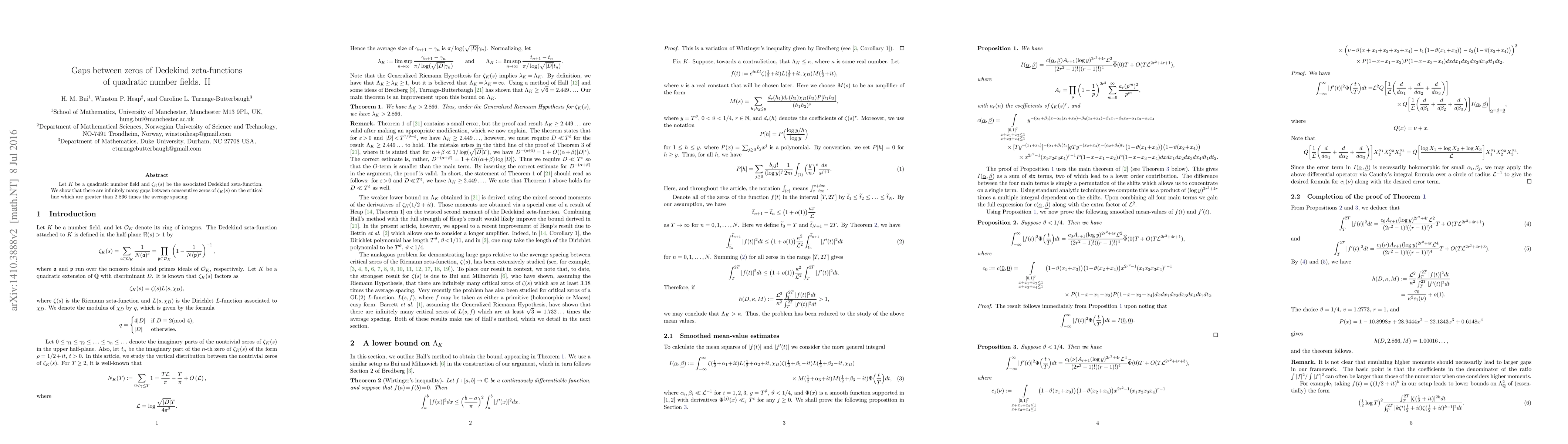 Research shows that there are infinitely many gaps between zeros of a specific zeta function in quadratic number fields, with some gaps larger than 2.866 times the average spacing.